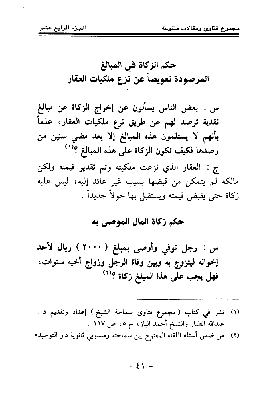 س: بعض الناس يسألون عن إخراج الزكاة عن مبالغ نقدية ترصد لهم عن طريق نزع ملكيات العقار، علما بأنهم لا يستلمون هذه المبالغ إلا بعد مضي سنين من رصدها فكيف تكون الزكاة على هذه المبالغ؟ .