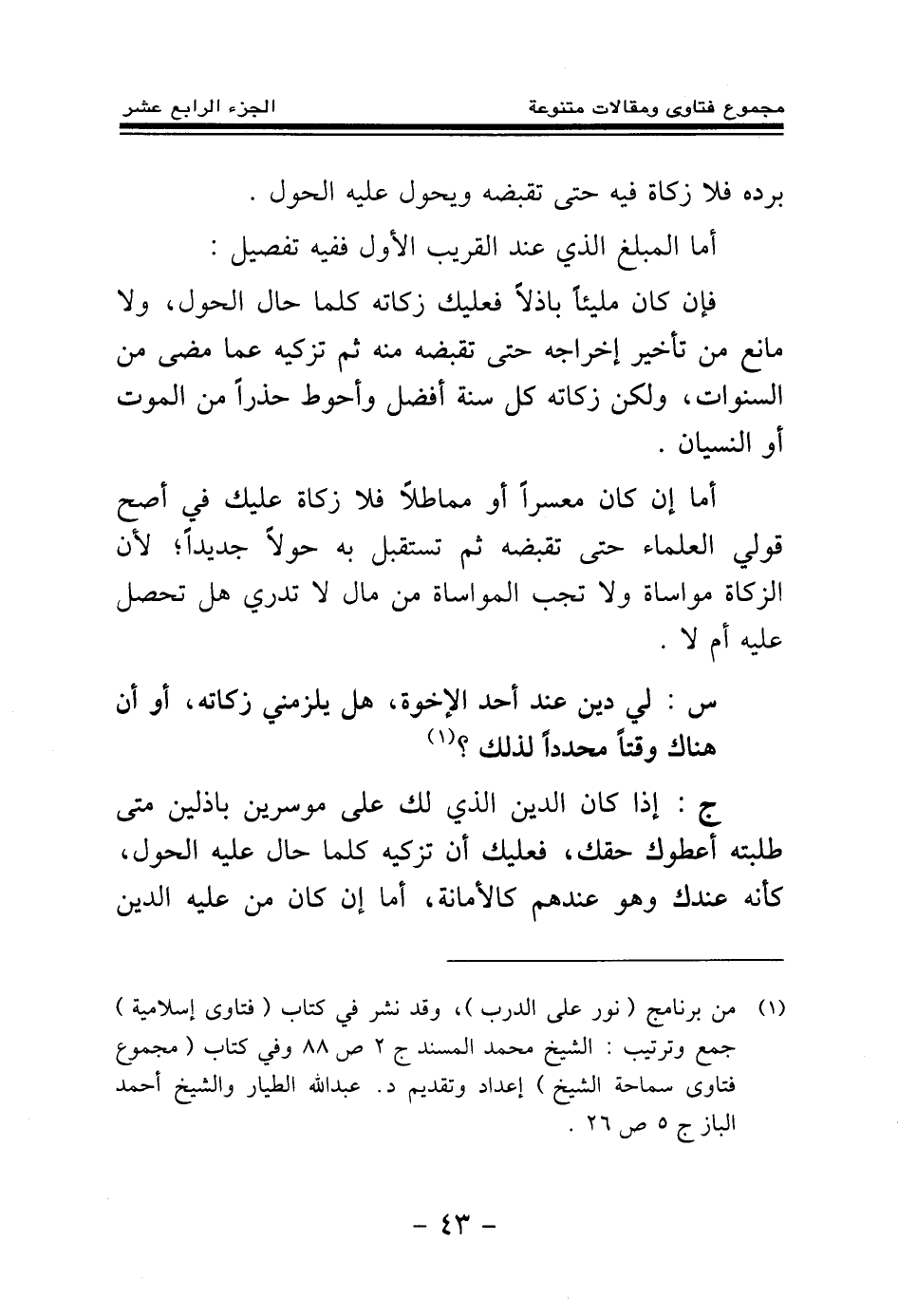 ج: إذا كان الدين الذي لك على موسرين باذلين متى طلبته أعطوك حقك، فعليك أن تزكيه كلما حال عليه الحول، كأنه عندك وهو عندهم كالأمانة، أما إن كان من عليه الدين