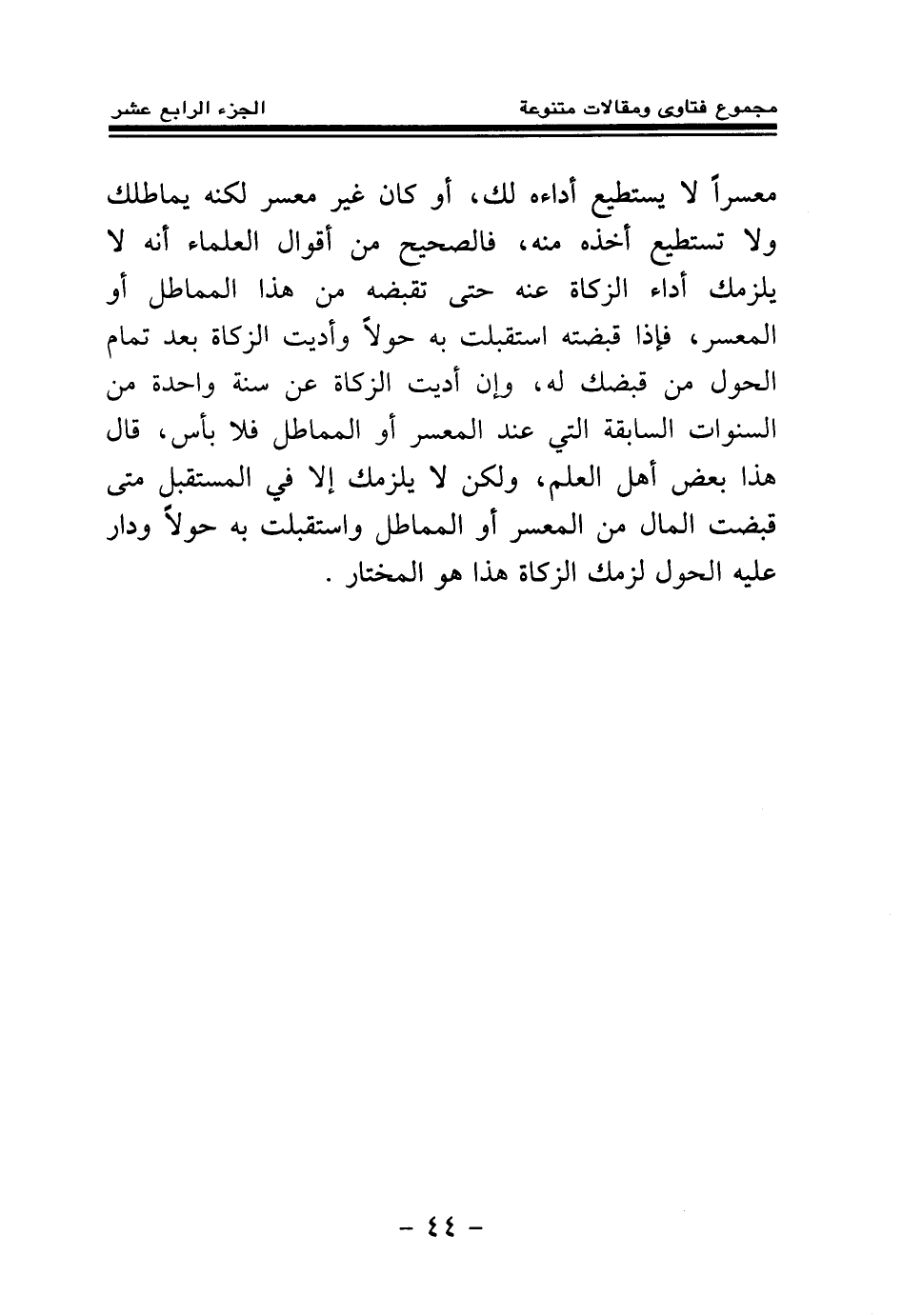 معسرا لا يستطيع أداءه لك، أو كان غير معسر لكنه يماطلك ولا تستطيع أخذه منه، فالصحيح من أقوال العلماء أنه لا يلزمك أداء الزكاة عنه حتى تقبضه من هذا المماطل أو المعسر، فإذا قبضته استقبلت به حولا وأديت الزكاة بعد تمام الحول من قبضك له، وإن أديت الزكاة عن سنة واحدة من السنوات السابقة التي عند المعسر أو المماطل فلا بأس، قال هذا بعض أهل العلم، ولكن لا يلزمك إلا في المستقبل متى قبضت المال من المعسر أو المماطل واستقبلت به حولا ودار عليه الحول؛ لزمك الزكاة، هذا هو المختار.