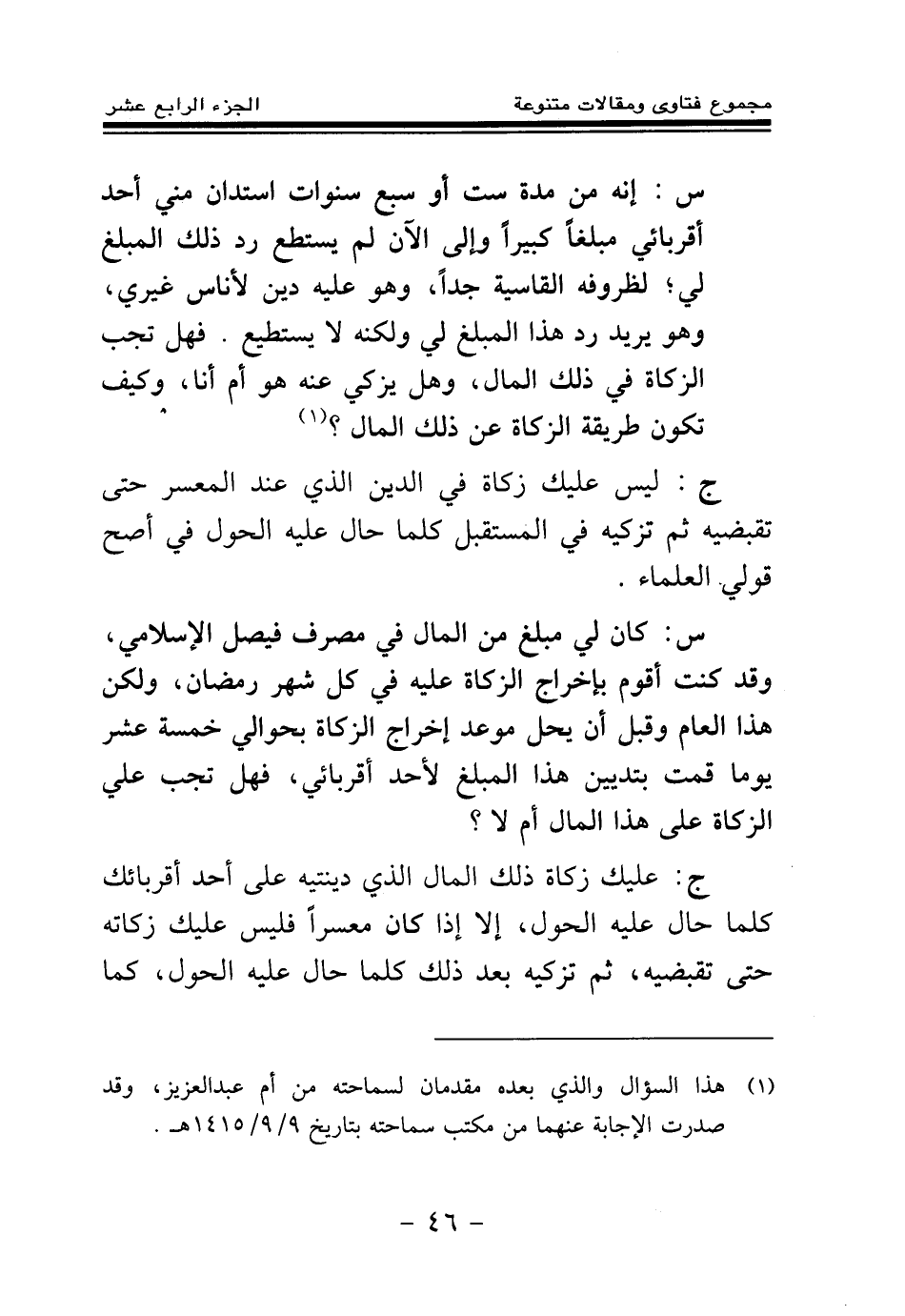 ج: عليك زكاة ذلك المال الذي دينتيه على أحد أقربائك كلما حال عليه الحول، إلا إذا كان معسرا فليس عليك زكاته حتى تقبضيه، ثم تزكيه بعد ذلك كلما حال عليه الحول، كما