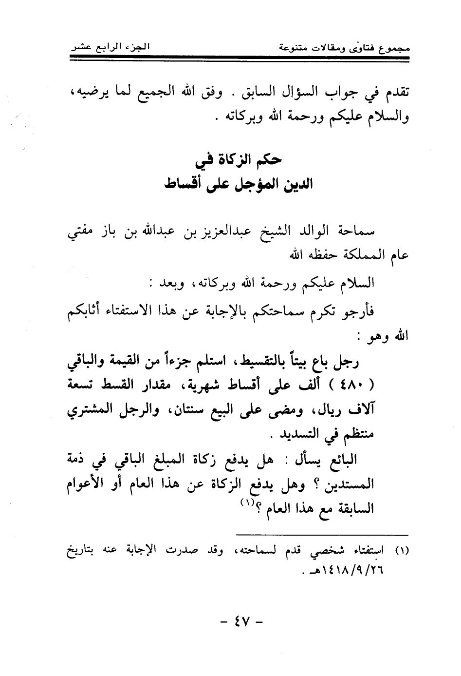 (¬1) استفتاء شخصي قدم لسماحته، وقد صدرت الإجابة عنه بتاريخ 26\9\1418هـ.