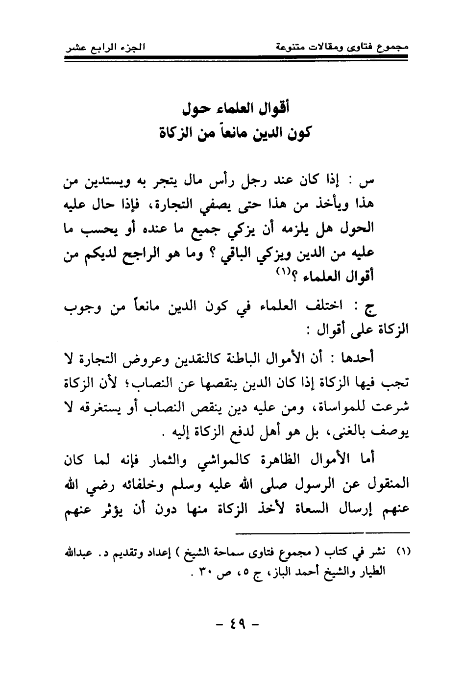 س: إذا كان عند رجل رأس مال يتجر به ويستدين من هذا ويأخذ من هذا حتى يصفي التجارة، فإذا حال عليه الحول هل يلزمه أن يزكي جميع ما عنده أو يحسب ما عليه من الدين ويزكي الباقي؟ وما هو الراجح لديكم من أقوال العلماء؟ .