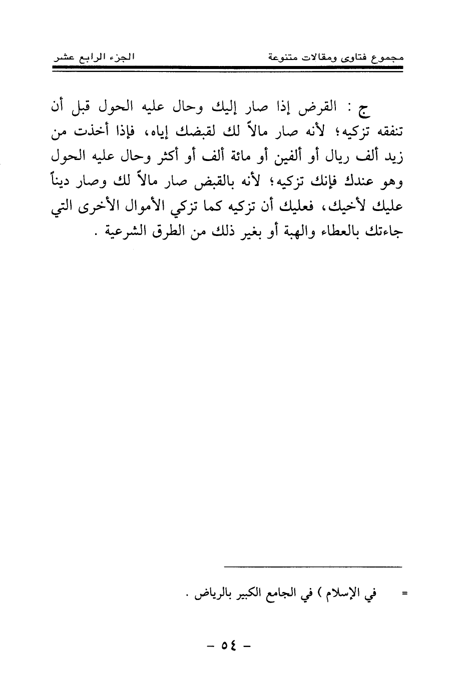ج: القرض إذا صار إليك وحال عليه الحول قبل أن تنفقه تزكيه؛ لأنه صار مالا لك لقبضك إياه، فإذا أخذت من زيد ألف ريال أو ألفين أو مائة ألف أو أكثر وحال عليه الحول وهو عندك فإنك تزكيه؛ لأنه بالقبض صار مالا لك وصار دينا عليك لأخيك؛ فعليك أن تزكيه كما تزكي الأموال الأخرى التي جاءتك بالعطاء والهبة أو بغير ذلك من الطرق الشرعية.