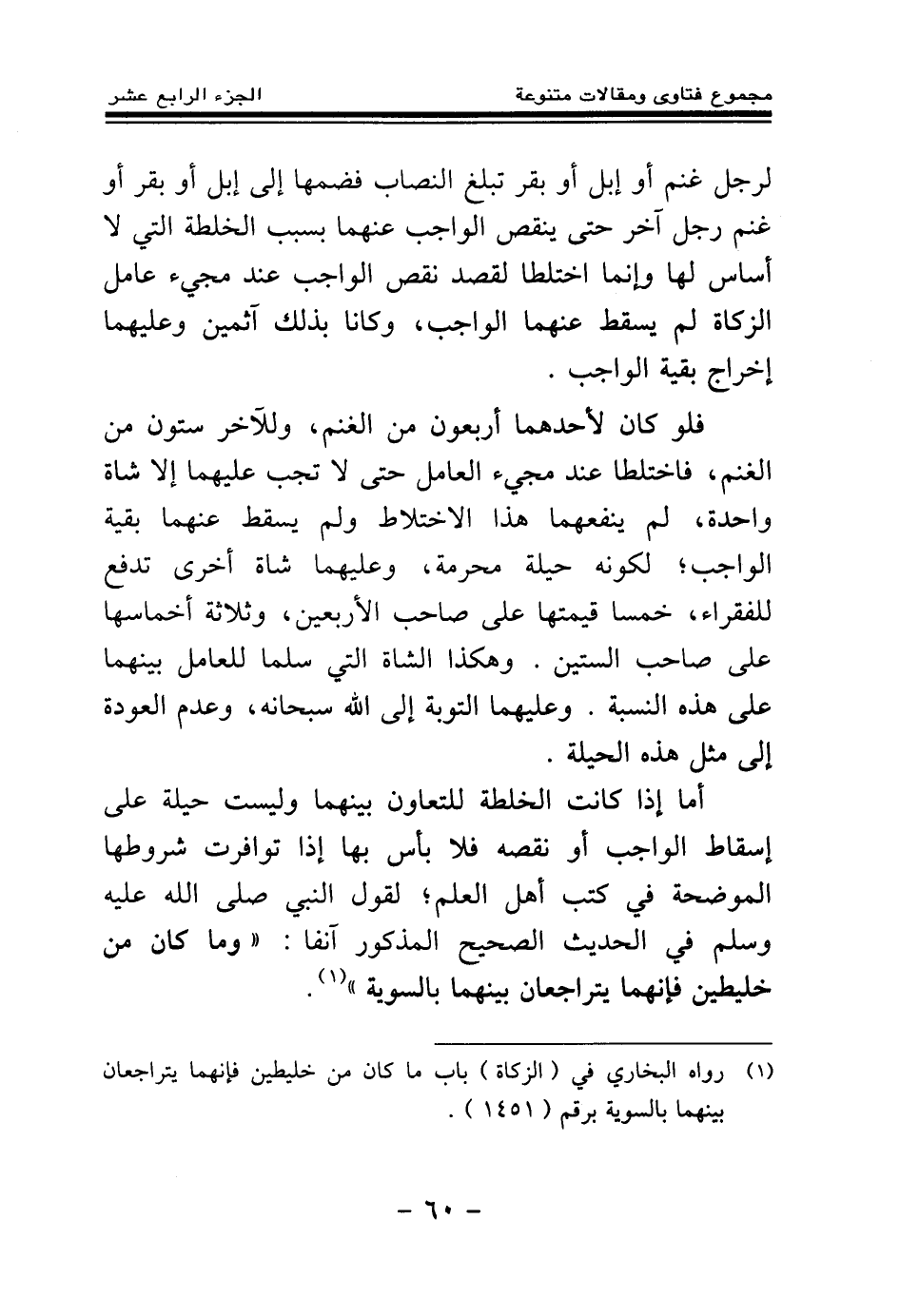 فلو كان لأحدهما أربعون من الغنم، وللآخر ستون من الغنم، فاختلطا عند مجيء العامل حتى لا تجب عليهما إلا شاة واحدة، لم ينفعهما هذا الاختلاط ولم يسقط عنهما بقية الواجب؛ لكونه حيلة محرمة، وعليهما شاة أخرى تدفع للفقراء، خمسا قيمتها على صاحب الأربعين، وثلاثة أخماسها على صاحب الستين. وهكذا الشاة التي سلما للعامل بينهما على هذه النسبة. وعليهما التوبة إلى الله سبحانه، وعدم العودة إلى مثل هذه الحيلة.