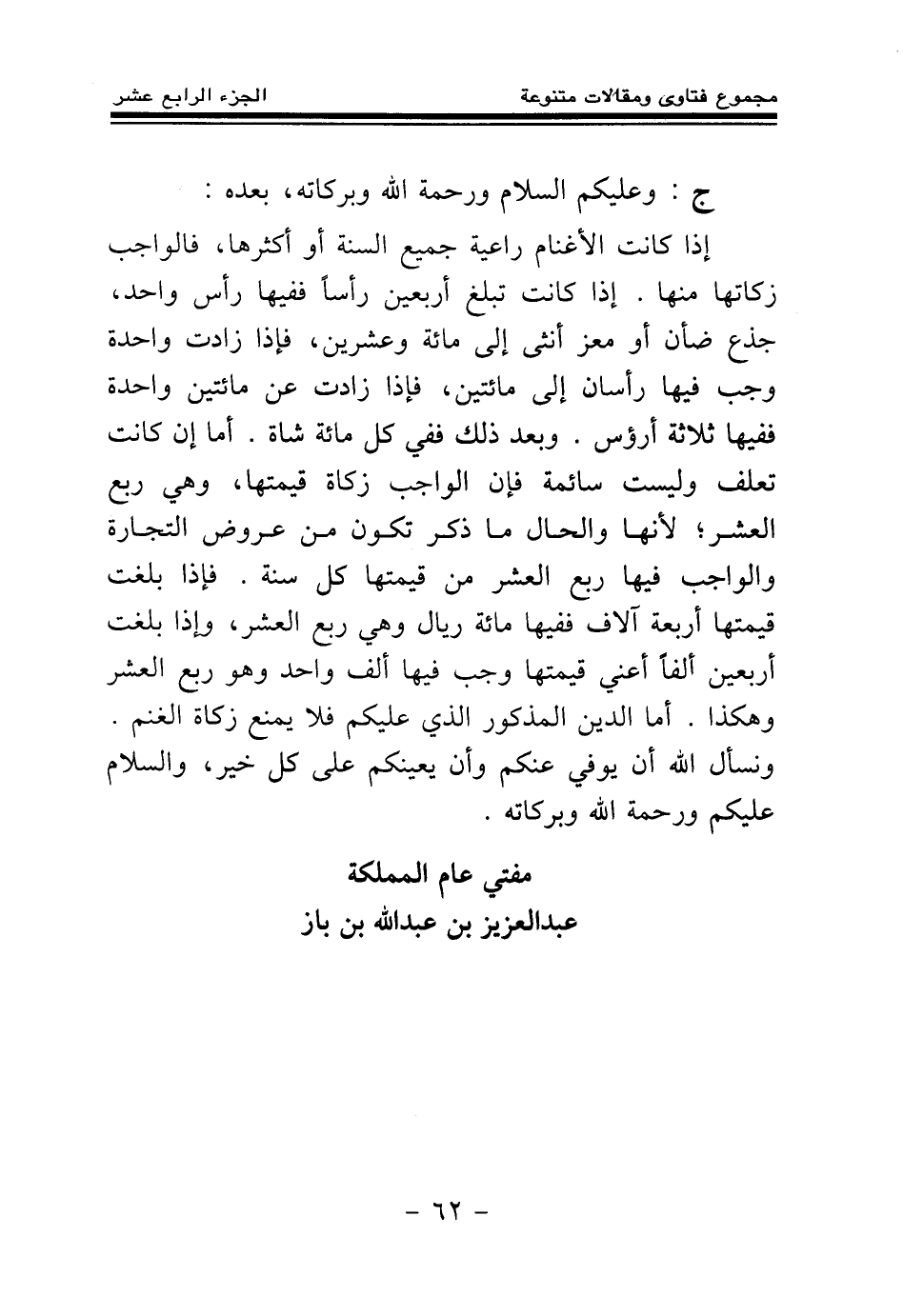 إذا كانت الأغنام راعية جميع السنة أو أكثرها، فالواجب زكاتها منها. إذا كانت تبلغ أربعين رأسا ففيها رأس واحد، جذع ضأن أو معز أنثى إلى مائة وعشرين، فإذا زادت واحدة وجب فيها رأسان إلى مائتين، فإذا زادت عن مائتين واحدة ففيها ثلاثة أرؤس. وبعد ذلك ففي كل مائة شاة. أما إن كانت تعلف وليست سائمة فإن الواجب زكاة قيمتها، وهي ربع العشر؛ لأنها والحال ما ذكر تكون من عروض التجارة والواجب فيها ربع العشر من قيمتها كل سنة. فإذا بلغت قيمتها أربعة آلاف ففيها مائة ريال، وهي ربع العشر، وإذا بلغت أربعين ألفا أعني قيمتها وجب فيها ألف واحد وهو ربع العشر وهكذا. أما الدين المذكور الذي عليكم فلا يمنع زكاة الغنم. ونسأل الله أن يوفي عنكم وأن يعينكم على كل خير، والسلام عليكم ورحمة الله وبركاته.