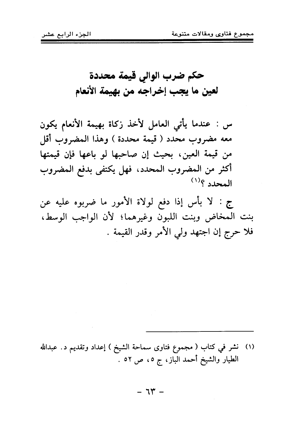 ج: لا بأس إذا دفع لولاة الأمور ما ضربوه عليه عن بنت المخاض وبنت اللبون وغيرهما؛ لأن الواجب الوسط، فلا حرج إن اجتهد ولي الأمر وقدر القيمة.