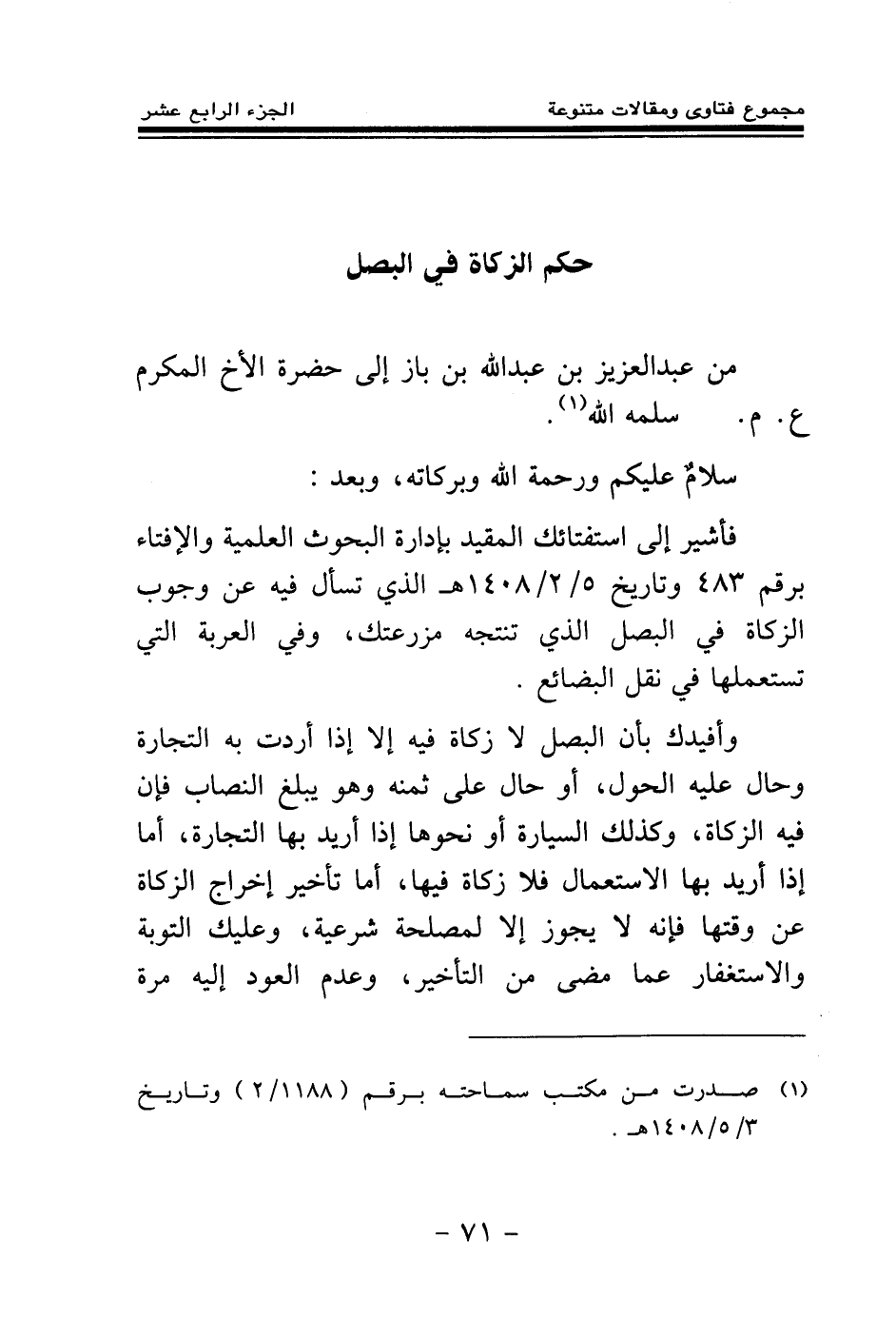 فأشير إلى استفتائك المقيد بإدارة البحوث العلمية والإفتاء برقم 483 وتاريخ 5\2\1408هـ الذي تسأل فيه عن وجوب الزكاة في البصل الذي تنتجه مزرعتك، وفي العربة التي تستعملها في نقل البضائع.