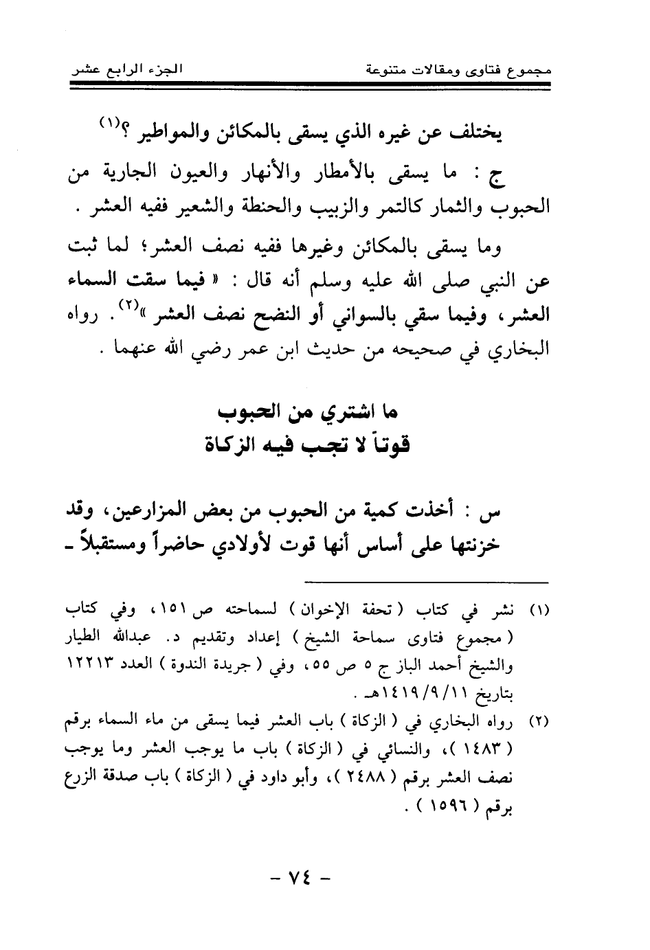 وما يسقى بالمكائن وغيرها ففيه نصف العشر؛ لما ثبت عن النبي - صلى الله عليه وسلم - أنه قال: «فيما سقت السماء العشر، وفيما سقي بالسواني أو النضح نصف العشر (¬1) » . رواه البخاري في صحيحه من حديث ابن عمر - رضي الله عنهما.