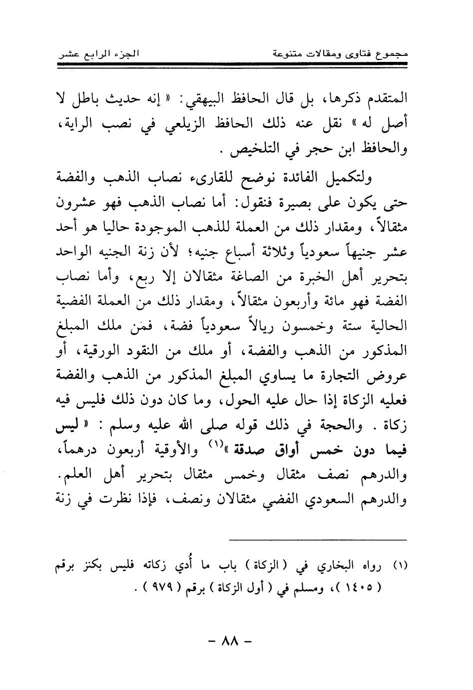 ولتكميل الفائدة نوضح للقارئ نصاب الذهب والفضة حتى يكون على بصيرة فنقول: أما نصاب الذهب فهو عشرون مثقالا، ومقدار ذلك من العملة للذهب الموجودة حاليا هو أحد عشر جنيها سعوديا وثلاثة أسباع جنيه؛ لأن زنة الجنيه الواحد بتحرير أهل الخبرة من الصاغة مثقالان إلا ربع، وأما نصاب الفضة فهو مائة وأربعون مثقالا، ومقدار ذلك من العملة الفضية الحالية ستة وخمسون ريالا سعوديا فضة، فمن ملك المبلغ المذكور من الذهب والفضة، أو ملك من النقود الورقية، أو عروض التجارة ما يساوي المبلغ المذكور من الذهب والفضة فعليه الزكاة إذا حال عليه الحول، وما كان دون ذلك فليس فيه زكاة. والحجة في ذلك قوله - صلى الله عليه وسلم -: «ليس فيما دون خمس أواق صدقة (¬1) » . والأوقية أربعون درهما، والدرهم نصف مثقال وخمس مثقال بتحرير أهل العلم. والدرهم السعودي الفضي مثقالان ونصف، فإذا نظرت في زنة