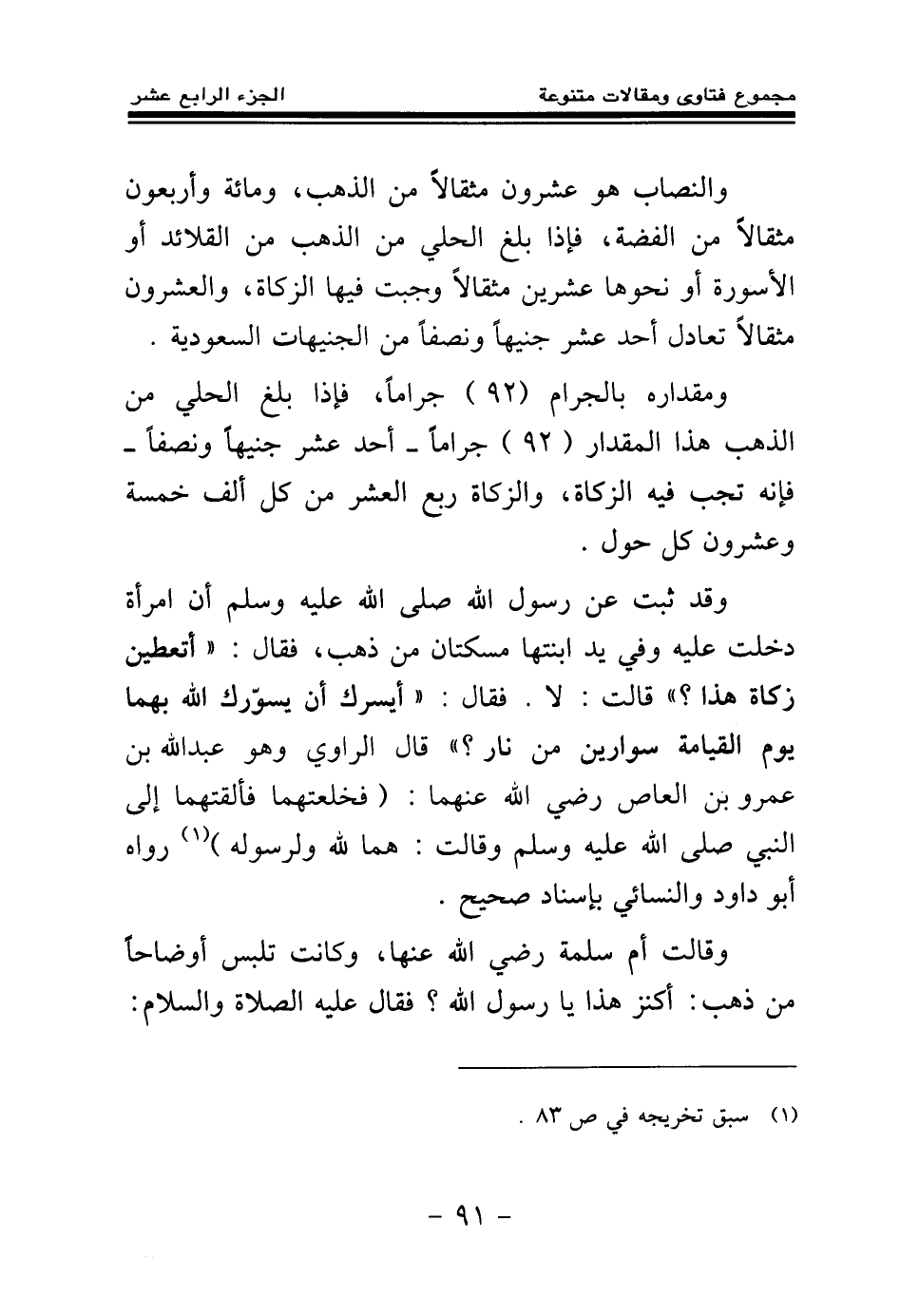 ومقداره بالجرام (92) جراما، فإذا بلغ الحلي من الذهب هذا المقدار (92) جراما - أحد عشر جنيها ونصفا - فإنه تجب فيه الزكاة، والزكاة ربع العشر من كل ألف خمسة وعشرون كل حول.