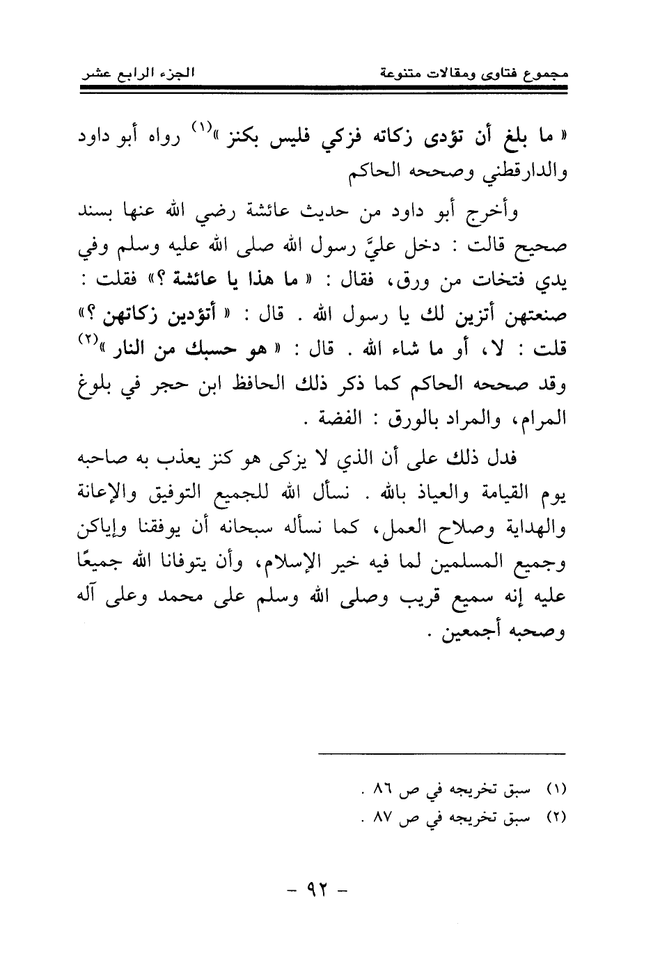 وأخرج أبو داود من حديث عائشة - رضي الله عنها - بسند صحيح قالت: «دخل علي رسول الله - صلى الله عليه وسلم - وفي يدي فتخات من ورق، فقال: ما هذا يا عائشة؟ فقلت: صنعتهن أتزين لك يا رسول الله. قال: أتؤدين زكاتهن؟ قلت: لا، أو ما شاء الله. قال: هو حسبك من النار (¬2) » . وقد صححه الحاكم كما ذكر ذلك الحافظ ابن حجر في بلوغ المرام، والمراد بالورق: الفضة.
