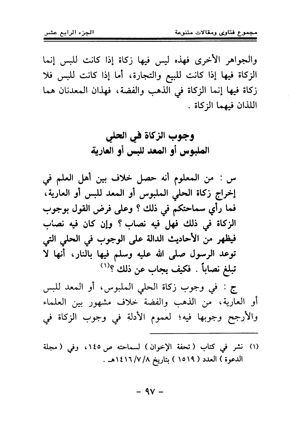 س: من المعلوم أنه حصل خلاف بين أهل العلم في إخراج زكاة الحلي الملبوس أو المعد للبس أو العارية، فما رأي سماحتكم في ذلك؟ وعلى فرض القول بوجوب الزكاة في ذلك فهل فيه نصاب؟ وإن كان فيه نصاب فيظهر من الأحاديث الدالة على الوجوب في الحلي التي توعد الرسول - صلى الله عليه وسلم - فيها بالنار، أنها لا تبلغ نصابا. فكيف يجاب عن ذلك؟ (¬1)