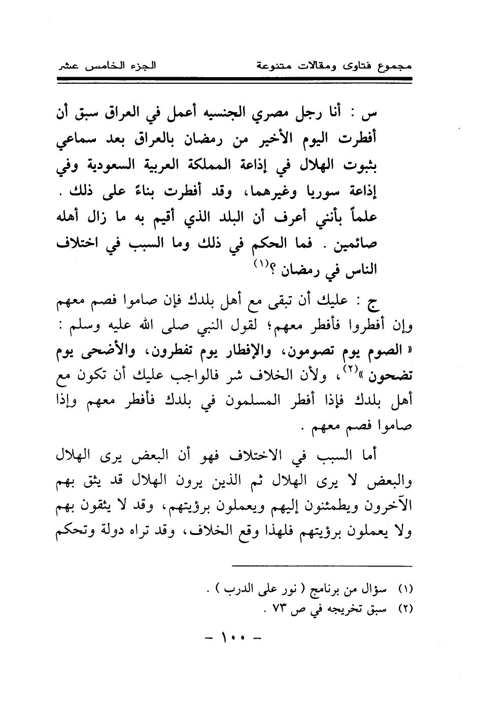 ج: عليك أن تبقى مع أهل بلدك، فإن صاموا فصم معهم، وإن أفطروا فأفطر معهم؛ لقول النبي صلى الله عليه وسلم: «الصوم يوم تصومون، والإفطار يوم تفطرون، والأضحى يوم تضحون (¬2) » ، ولأن الخلاف شر فالواجب عليك أن تكون مع أهل بلدك، فإذا أفطر المسلمون في بلدك فأفطر معهم، وإذا صاموا فصم معهم.