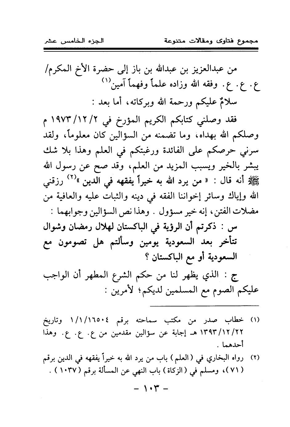 فقد وصلني كتابكم الكريم المؤرخ في 2 \ 12 \ 1973 م وصلكم الله بهداه، وما تضمنه من السؤالين كان معلوما، ولقد سرني حرصكم على الفائدة ورغبتكم في العلم، وهذا بلا شك يبشر بالخير ويسبب المزيد من العلم، وقد صح عن رسول الله صلى الله عليه وسلم أنه قال: «من يرد الله به خيرا يفقهه في الدين (¬1) » .