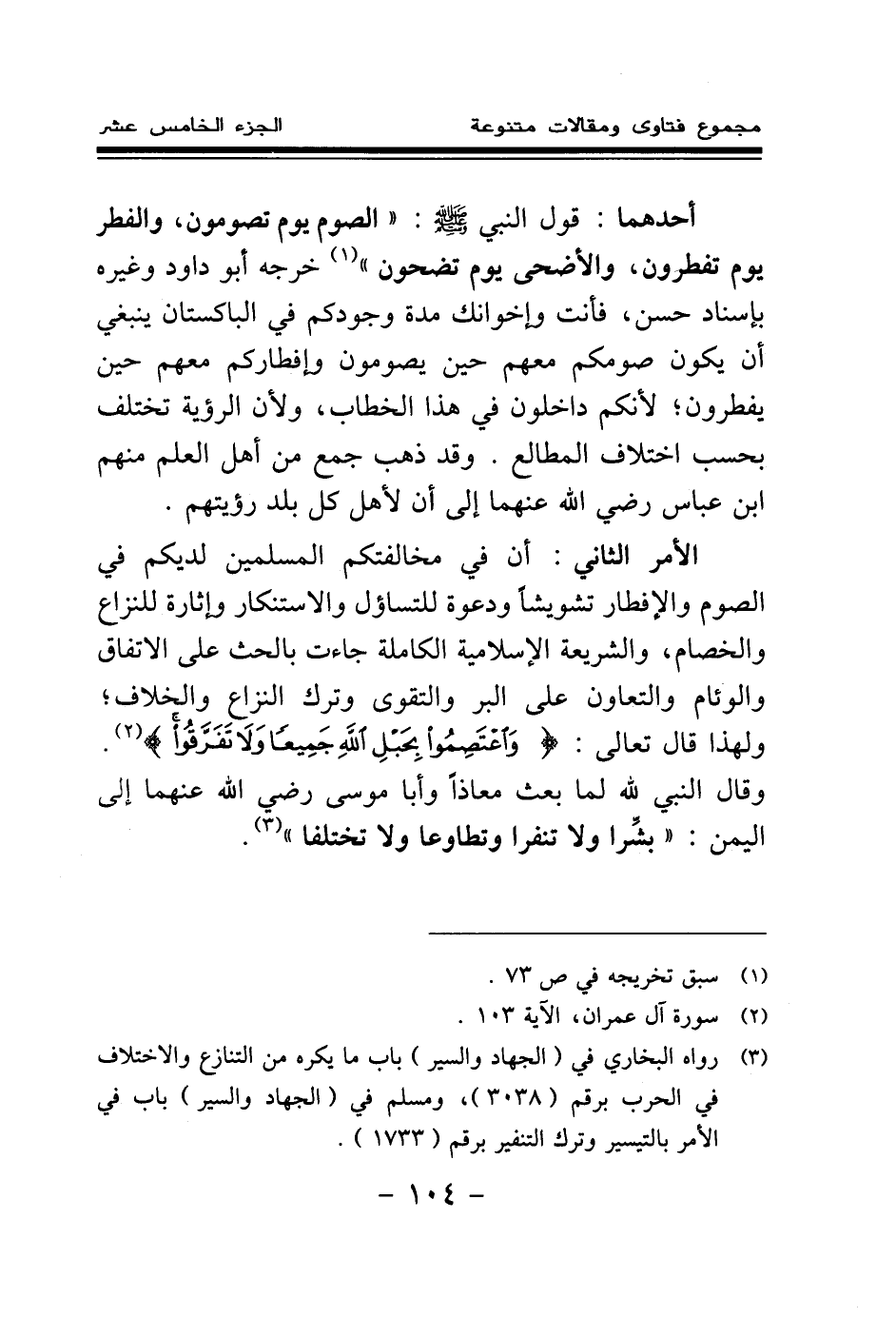 الأمر الثاني: أن في مخالفتكم المسلمين لديكم في الصوم والإفطار تشويشا ودعوة للتساؤل والاستنكار وإثارة للنزاع والخصام، والشريعة الإسلامية الكاملة جاءت بالحث على الاتفاق والوئام والتعاون على البر والتقوى وترك النزاع والحلاف؛ ولهذا قال تعالى: {وَاعْتَصِمُوا بِحَبْلِ اللَّهِ جَمِيعًا وَلَا تَفَرَّقُوا} (¬2) وقال النبي صلى الله عليه وسلم لما بعث معاذا وأبا موسى رضي الله عنهما إلى اليمن: «بشرا ولا تنفرا وتطاوعا ولا تختلفا (¬3) » .