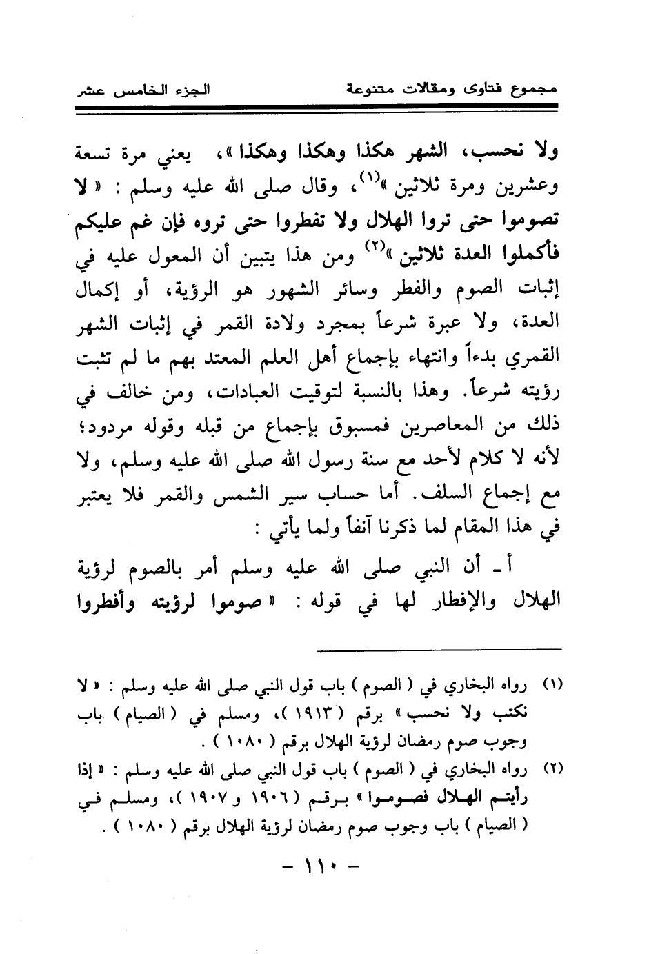 ومن هذا يتبين أن المعول عليه في إثبات الصوم والفطر وسائر الشهور هو الرؤية، أو إكمال العدة، ولا عبرة شرعا بمجرد ولادة القمر في إثبات الشهر القمري بدءا وانتهاء بإجماع أهل العلم المعتد بهم، ما لم تثبت رؤيته شرعا. وهذا بالنسبة لتوقيت العبادات، ومن خالف في ذلك من المعاصرين فمسبوق بإجماع من قبله وقوله مردود؛ لأنه لا كلام لأحد مع سنة رسول الله صلى الله عليه وسلم، ولا مع إجماع السلف. أما حساب سير الشمس والقمر فلا يعتبر في هذا المقام؛ لما ذكرنا آنفا، ولما يأتي: