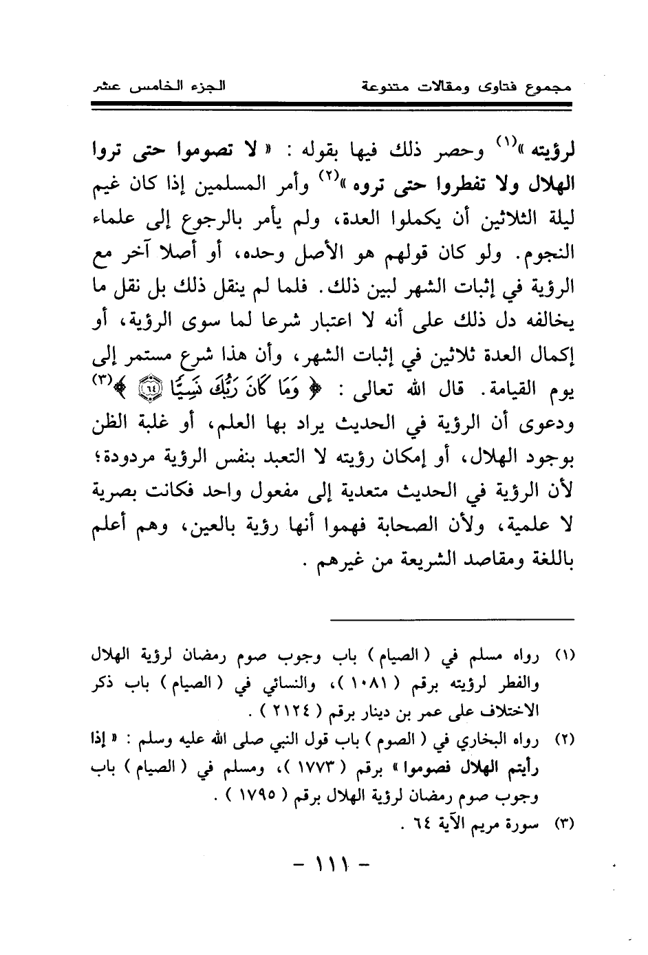 وأمر المسلمين إذا كان غيم ليلة الثلاثين أن يكملوا العدة، ولم يأمر بالرجوع إلى علماء النجوم. ولو كان قولهم هو الأصل وحده، أو أصلا آخر مع الرؤية في إثبات الشهر لبين ذلك. فلما لم ينقل ذلك، بل نقل ما يخالفه، دل ذلك على أنه لا اعتبار شرعا لما سوى الرؤية، أو إكمال العدة ثلاثين في إثبات الشهر، وأن هذا شرع مستمر إلى يوم القيامة. قال الله تعالى: {وَمَا كَانَ رَبُّكَ نَسِيًّا} (¬3)