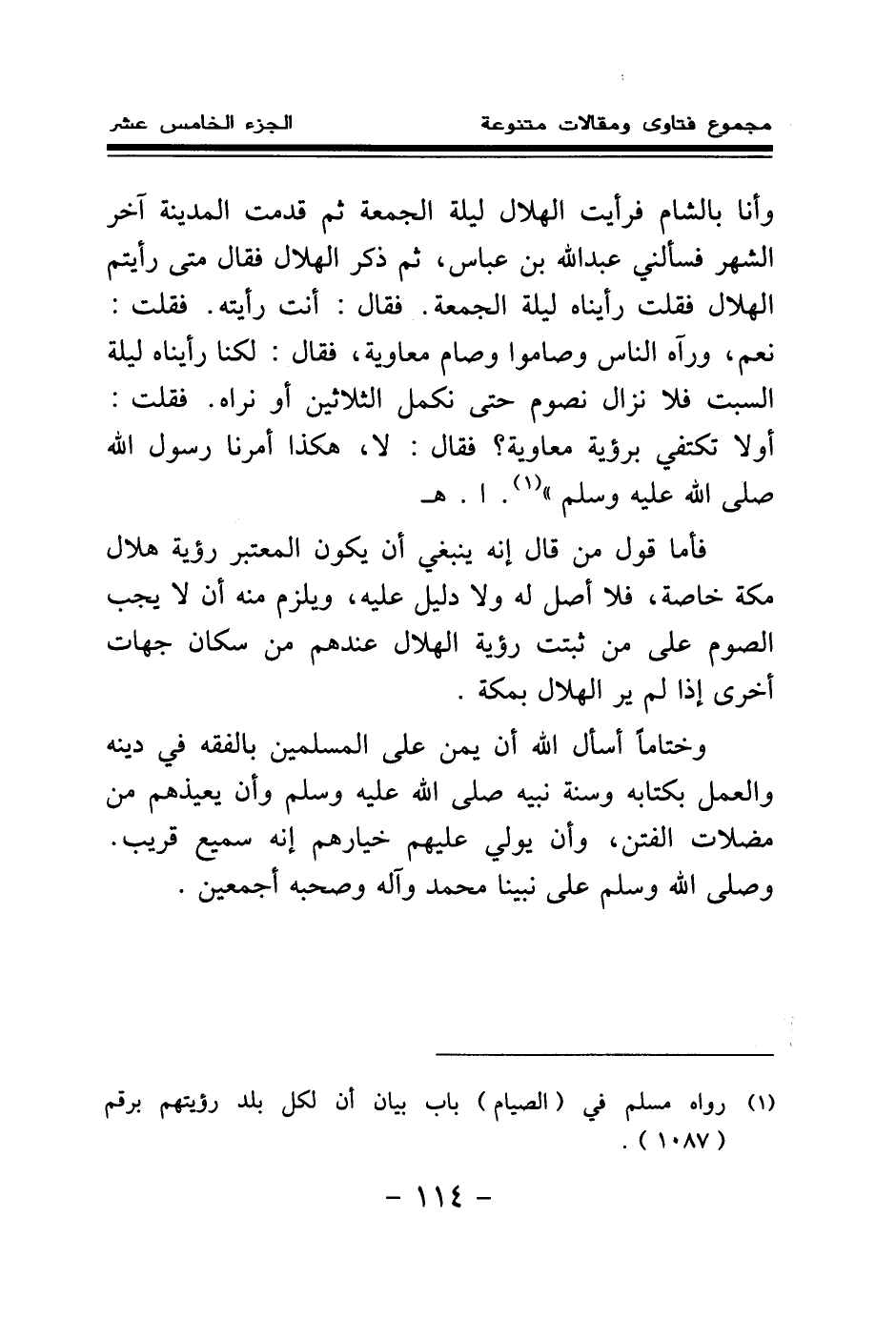 (¬1) رواه مسلم في (الصيام) باب بيان أن لكل بلد رؤيتهم برقم (1087) .