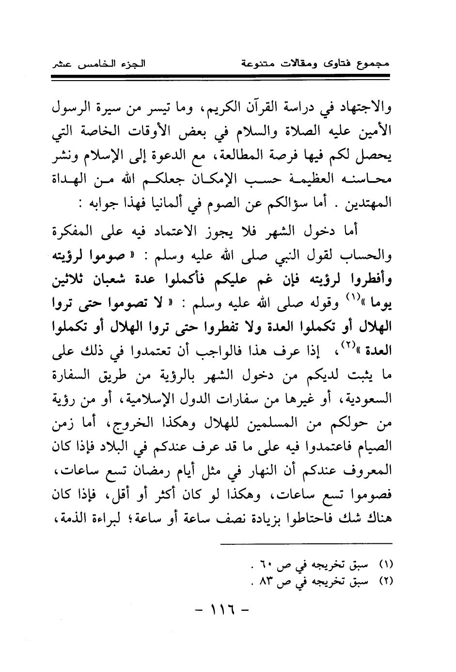 أما دخول الشهر فلا يجوز الاعتماد فيه على المفكرة والحساب؛ لقول النبي صلى الله عليه وسلم: «صوموا لرؤيته وأفطروا لرؤيته، فإن غم عليكم فأكملوا عدة شعبان ثلاثين يوما (¬1) » ، وقوله صلى الله عليه وسلم: «لا تصوموا حتى تروا الهلال، أو تكملوا العدة، ولا تفطروا حتى تروا الهلال، أو تكملوا العدة (¬2) » ، إذا عرف هذا فالواجب أن تعتمدوا في ذلك على ما يثبت لديكم من دخول الشهر بالرؤية من طريق السفارة السعودية، أو غيرها من سفارات الدول الإسلامية، أو من رؤية من حولكم من المسلمين للهلال وهكذا الخروج، أما زمن الصيام فاعتمدوا فيه على ما قد عرف عندكم في البلاد، فإذا كان المعروف عندكم أن النهار في مثل أيام رمضان تسع ساعات، فصوموا تسع ساعات، وهكذا لو كان أكثر أو أقل، فإذا كان هناك شك فاحتاطوا بزيادة نصف ساعة أو ساعة لبراءة الذمة،