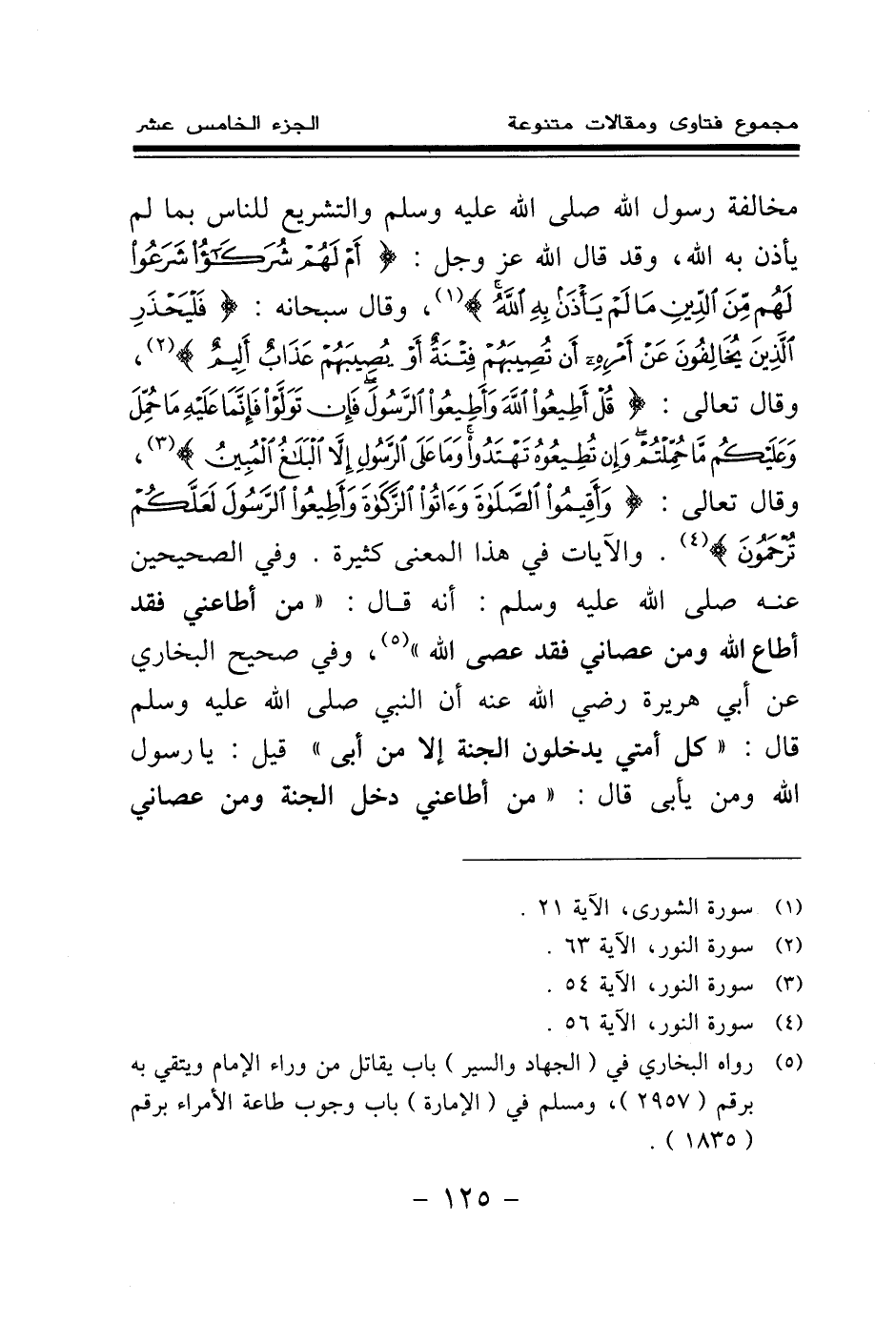 مخالفة رسول الله صلى الله عليه وسلم والتشريع للناس بما لم يأذن به الله، وقد قال الله عز وجل: {أَمْ لَهُمْ شُرَكَاءُ شَرَعُوا لَهُمْ مِنَ الدِّينِ مَا لَمْ يَأْذَنْ بِهِ اللَّهُ} (¬1) وقال سبحانه: {فَلْيَحْذَرِ الَّذِينَ يُخَالِفُونَ عَنْ أَمْرِهِ أَنْ تُصِيبَهُمْ فِتْنَةٌ أَوْ يُصِيبَهُمْ عَذَابٌ أَلِيمٌ} (¬2) وقال تعالى: {قُلْ أَطِيعُوا اللَّهَ وَأَطِيعُوا الرَّسُولَ فَإِنْ تَوَلَّوْا فَإِنَّمَا عَلَيْهِ مَا حُمِّلَ وَعَلَيْكُمْ مَا حُمِّلْتُمْ وَإِنْ تُطِيعُوهُ تَهْتَدُوا وَمَا عَلَى الرَّسُولِ إِلَّا الْبَلَاغُ الْمُبِينُ} (¬3) وقال تعالى: {وَأَقِيمُوا الصَّلَاةَ وَآتُوا الزَّكَاةَ وَأَطِيعُوا الرَّسُولَ لَعَلَّكُمْ تُرْحَمُونَ} (¬4) والآيات في هذا المعنى كثيرة.