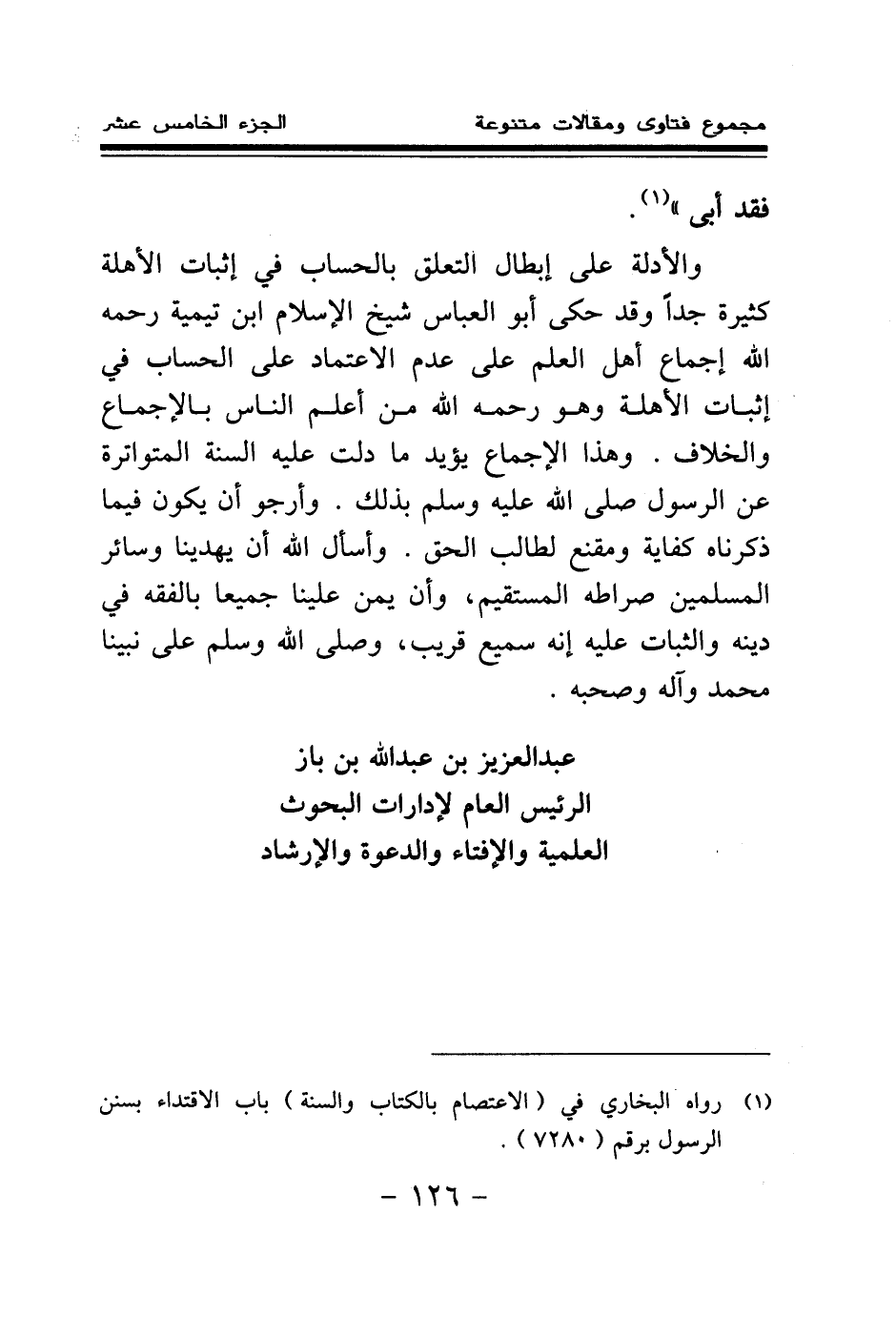 والأدلة على إبطال التعلق بالحساب في إثبات الأهلة كثيرة جدا، وقد حكى أبو العباس شيخ الإسلام ابن تيمية رحمه الله إجماع أهل العلم على عدم الاعتماد على الحساب في إثبات الأهلة، وهو رحمه الله من أعلم الناس بالإجماع والخلاف. وهذا الإجماع يؤيد ما دلت عليه السنة المتواترة عن الرسول صلى الله عليه وسلم بذلك. وأرجو أن يكون فيما ذكرناه كفاية ومقنع لطالب الحق. وأسأل الله أن يهدينا وسائر المسلمين صراطه المستقيم، وأن يمن علينا جميعا بالفقه في دينه والثبات عليه، إنه سميع قريب، وصلى الله وسلم على نبينا محمد وآله وصحبه.
