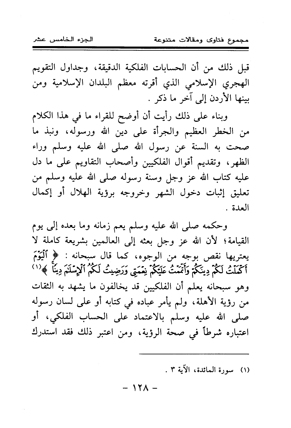 وحكمه صلى الله عليه وسلم يعم زمانه وما بعده إلى يوم القيامة؛ لأن الله عز وجل بعثه إلى العالمين بشريعة كاملة لا يعتريها نقص بوجه من الوجوه، كما قال سبحانه: {الْيَوْمَ أَكْمَلْتُ لَكُمْ دِينَكُمْ وَأَتْمَمْتُ عَلَيْكُمْ نِعْمَتِي وَرَضِيتُ لَكُمُ الْإِسْلَامَ دِينًا} (¬1) وهو سبحانه يعلم أن الفلكيين قد يخالفون ما يشهد به الثقات من رؤية الأهلة، ولم يأمر عباده في كتابه أو على لسان رسوله صلى الله عليه وسلم بالاعتماد على الحساب الفلكي، أو اعتباره شرطا في صحة الرؤية، ومن اعتبر ذلك فقد استدرك