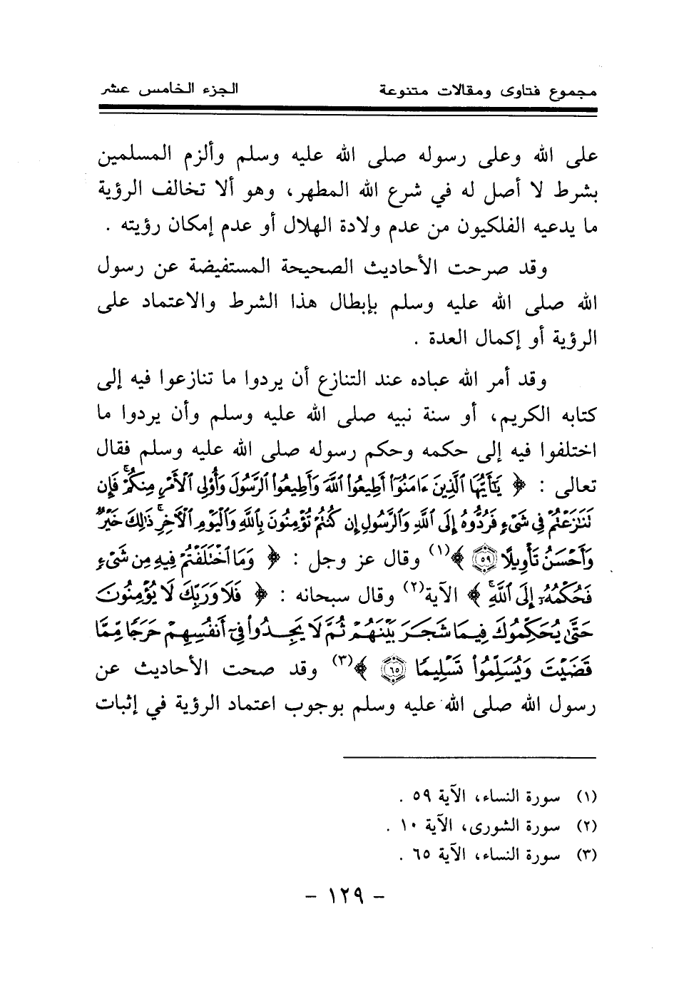 وقد أمر الله عباده عند التنازع أن يردوا ما تنازعوا فيه إلى كتابه الكريم، أو سنة نبيه صلى الله عليه وسلم، وأن يردوا ما اختلفوا فيه إلى حكمه وحكم رسوله صلى الله عليه وسلم، فقال تعالى: {يَا أَيُّهَا الَّذِينَ آمَنُوا أَطِيعُوا اللَّهَ وَأَطِيعُوا الرَّسُولَ وَأُولِي الْأَمْرِ مِنْكُمْ فَإِنْ تَنَازَعْتُمْ فِي شَيْءٍ فَرُدُّوهُ إِلَى اللَّهِ وَالرَّسُولِ إِنْ كُنْتُمْ تُؤْمِنُونَ بِاللَّهِ وَالْيَوْمِ الْآخِرِ ذَلِكَ خَيْرٌ وَأَحْسَنُ تَأْوِيلًا} (¬1) وقال عز وجل: {وَمَا اخْتَلَفْتُمْ فِيهِ مِنْ شَيْءٍ فَحُكْمُهُ إِلَى اللَّهِ} (¬2) الآية، وقال سبحانه: {فَلَا وَرَبِّكَ لَا يُؤْمِنُونَ حَتَّى يُحَكِّمُوكَ فِيمَا شَجَرَ بَيْنَهُمْ ثُمَّ لَا يَجِدُوا فِي أَنْفُسِهِمْ حَرَجًا مِمَّا قَضَيْتَ وَيُسَلِّمُوا تَسْلِيمًا} (¬3) وقد صحت الأحاديث عن رسول الله صلى الله عليه وسلم بوجوب اعتماد الرؤية في إثبات