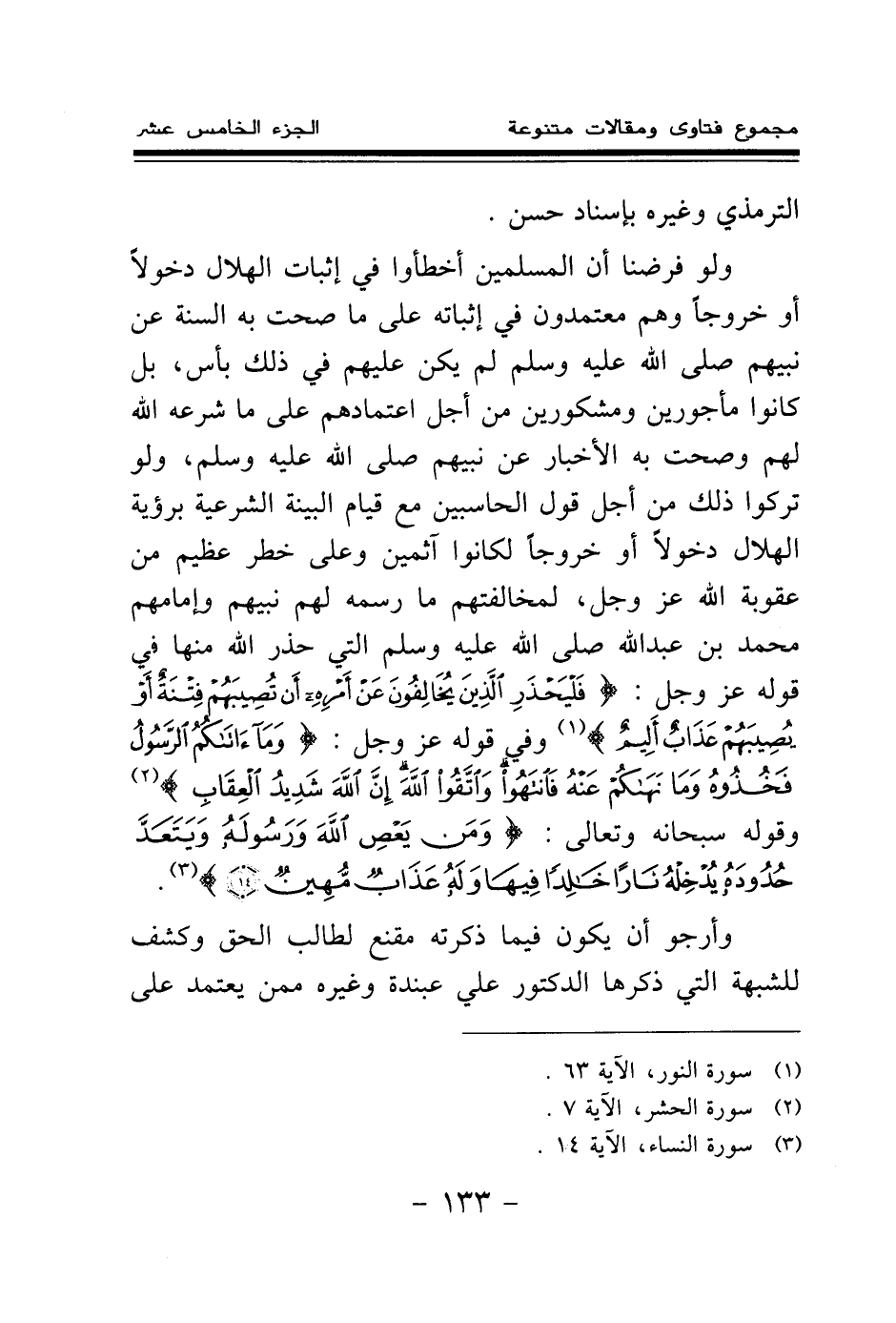 ولو فرضنا أن المسلمين أخطئوا في إثبات الهلال دخولا أو خروجا وهم معتمدون في إثباته على ما صحت به السنة عن نبيهم صلى الله عليه وسلم لم يكن عليهم في ذلك بأس، بل كانوا مأجورين ومشكورين من أجل اعتمادهم على ما شرعه الله لهم وصحت به الأخبار عن نبيهم صلى الله عليه وسلم، ولو تركوا ذلك من أجل قول الحاسبين مع قيام البينة الشرعية برؤية الهلال دخولا أو خروجا لكانوا آثمين وعلى خطر عظيم من عقوبة الله عز وجل، لمخالفتهم ما رسمه لهم نبيهم وإمامهم محمد بن عبد الله صلى الله عليه وسلم التي حذر الله منها في قوله عز وجل: {فَلْيَحْذَرِ الَّذِينَ يُخَالِفُونَ عَنْ أَمْرِهِ أَنْ تُصِيبَهُمْ فِتْنَةٌ أَوْ يُصِيبَهُمْ عَذَابٌ أَلِيمٌ} (¬1)