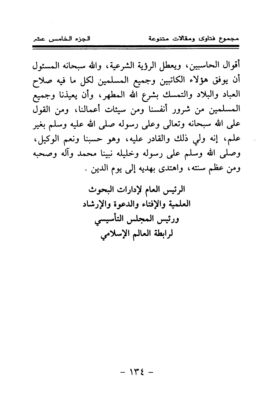 أقوال الحاسبين، ويعطل الرؤية الشرعية، والله سبحانه المسئول أن يوفق هؤلاء الكاتبين وجميع المسلمين لكل ما فيه صلاح العباد والبلاد والتمسك بشرع الله المطهر، وأن يعيذنا وجميع المسلمين من شرور أنفسنا ومن سيئات أعمالنا، ومن القول على الله سبحانه وتعالى وعلى رسوله صلى الله عليه وسلم بغير علم، إنه ولي ذلك والقادر عليه، وهو حسبنا ونعم الوكيل، وصلى الله وسلم على رسوله وخليله، نبينا محمد وآله وصحبه ومن عظم سنته واهتدى بهديه إلى يوم الدين.