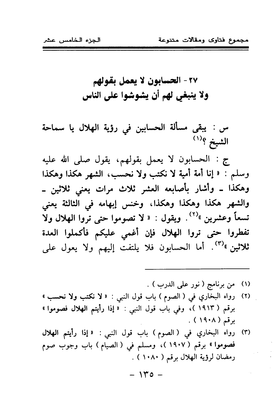 ج: الحسابون لا يعمل بقولهم، يقول صلى الله عليه وسلم: «إنا أمة أمية لا نكتب ولا نحسب، الشهر هكذا وهكذا وهكذا- وأشار بأصابعه العشر ثلاث مرات يعني ثلاثين - والشهر هكذا وهكذا وهكذا، وخنس إبهامه في الثالثة يعني تسعا وعشرين (¬2) » . ويقول: «لا تصوموا حتى تروا الهلال، ولا تفطروا حتى تروا الهلال، فإن أغمي عليكم فأكملوا العدة ثلاثين (¬3) » .