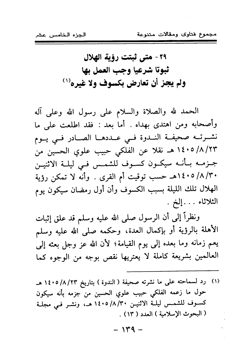 الحمد لله والصلاة والسلام على رسول الله وعلى آله وأصحابه ومن اهتدى بهداه. أما بعد: فقد اطلعت على ما نشرته صحيفة الندوة في عددها الصادر في يوم 23 \ 8 \ 1405 هـ نقلا عن الفلكي حبيب علوي الحسين من جزمه بأنه سيكون كسوف للشمس في ليلة الاثنين 30\8\1405 هـ حسب توقيت أم القرى. وأنه لا تمكن رؤية الهلال تلك الليلة بسبب الكسوف، وأن أول رمضان سيكون يوم الثلاثاء ... إلخ.