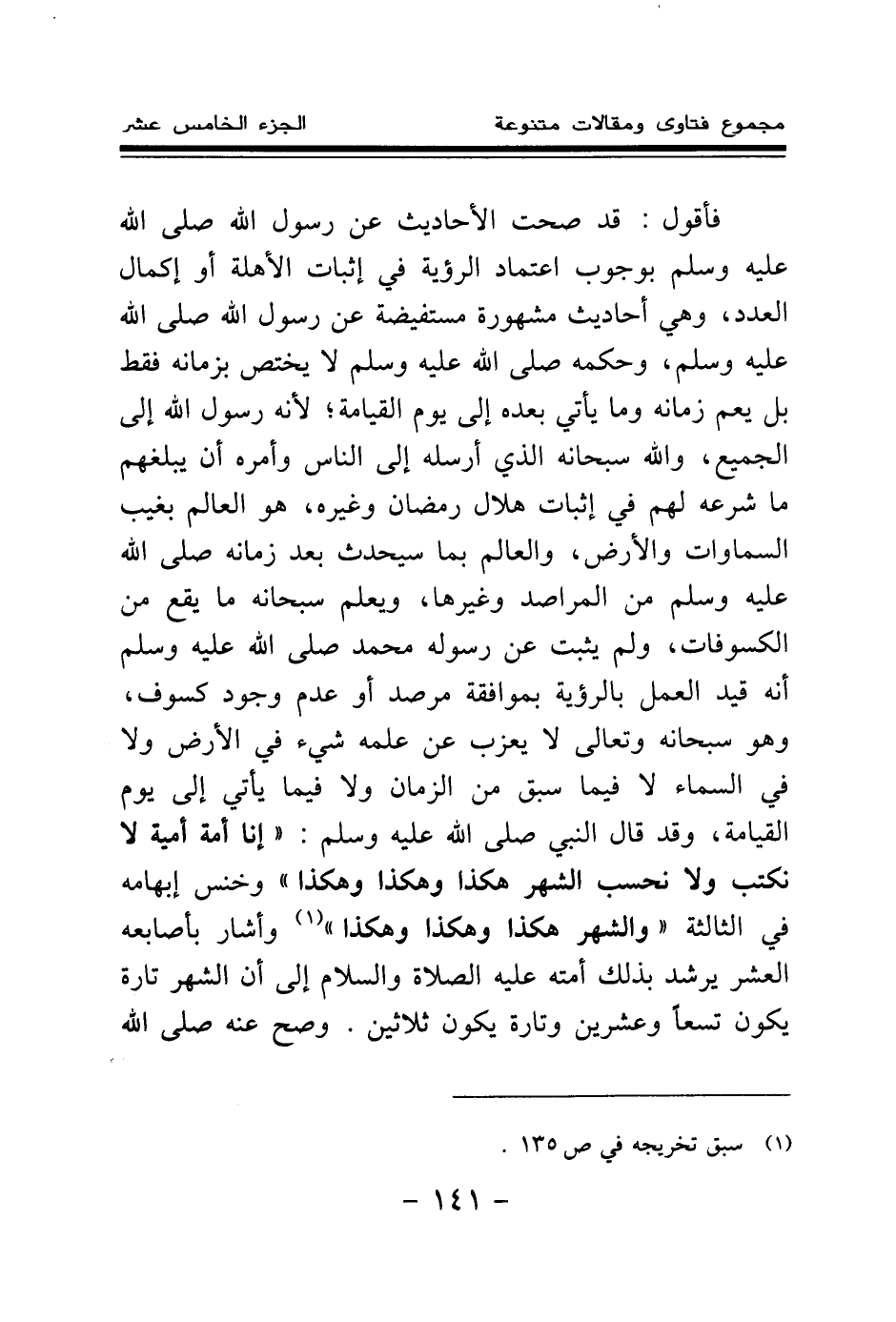 فأقول: قد صحت الأحاديث عن رسول الله صلى الله عليه وسلم بوجوب اعتماد الرؤية في إثبات الأهلة أو إكمال العدد، وهي أحاديث مشهورة مستفيضة عن رسول الله صلى الله عليه وسلم، وحكمه صلى الله عليه وسلم لا يختص بزمانه فقط، بل يعم زمانه وما يأتي بعده إلى يوم القيامة؛ لأنه رسول الله إلى الجميع، والله سبحانه الذي أرسله إلى الناس وأمره أن يبلغهم ما شرعه لهم في إثبات هلال رمضان وغيره، هو العالم بغيب السماوات والأرض، والعالم بما سيحدث بعد زمانه صلى الله عليه وسلم من المراصد وغيرها، ويعلم سبحانه ما يقع من الكسوفات، ولم يثبت عن رسوله محمد صلى الله عليه وسلم أنه قيد العمل بالرؤية بموافقة مرصد أو عدم وجود كسوف، وهو سبحانه وتعالى لا يعزب عن علمه شيء في الأرض ولا في السماء، لا فيما سبق من الزمان ولا فيما يأتي إلى يوم القيامة، وقد قال النبي صلى الله عليه وسلم: «إنا أمة أمية لا نكتب ولا نحسب، الشهر هكذا وهكذا وهكذا، وخنس إبهامه في الثالثة، والشهر هكذا وهكذا وهكذا، (¬1) » وأشار بأصابعه العشر يرشد بذلك أمته عليه الصلاة والسلام إلى أن الشهر تارة يكون تسعا وعشرين، وتارة يكون ثلاثين. وصح عنه صلى الله