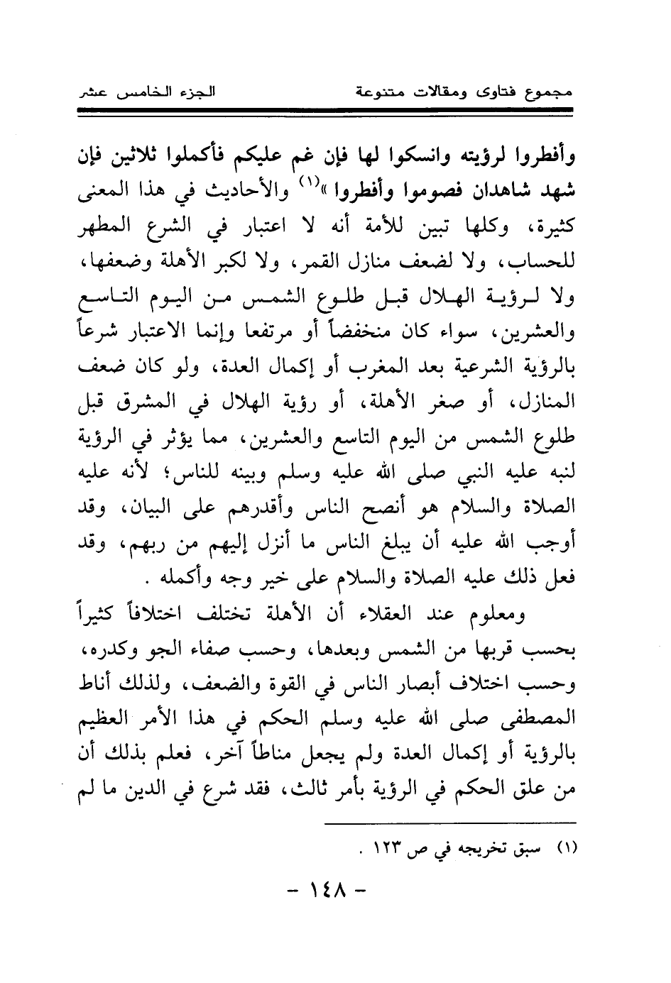 ومعلوم عند العقلاء أن الأهلة تختلف اختلافا كثيرا بحسب قربها من الشمس وبعدها، وحسب صفاء الجو وكدره، وحسب اختلاف أبصار الناس في القوة والضعف، ولذلك أناط المصطفى صلى الله عليه وسلم الحكم في هذا الأمر العظيم بالرؤية أو إكمال العدة ولم يجعل مناطا آخر، فعلم بذلك أن من علق الحكم في الرؤية بأمر ثالث، فقد شرع في الدين ما لم