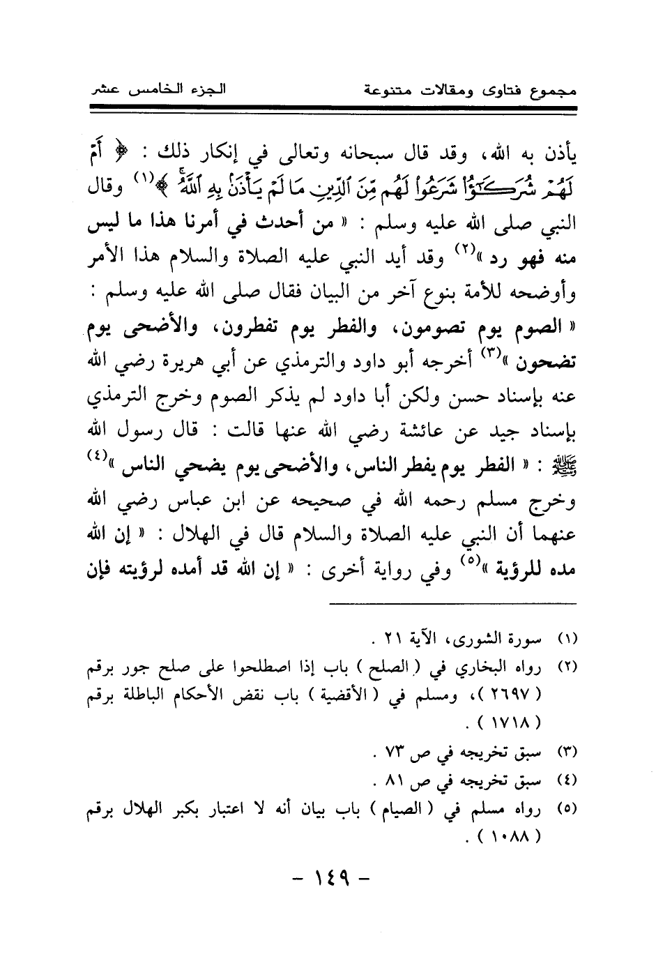 وقد أيد النبي عليه الصلاة والسلام هذا الأمر وأوضحه للأمة بنوع آخر من البيان، فقال صلى الله عليه وسلم: «الصوم يوم تصومون، والفطر يوم تفطرون، والأضحى يوم تضحون (¬3) » ، أخرجه أبو داود والترمذي عن أبي هريرة رضي الله عنه بإسناد حسن، ولكن أبا داود لم يذكر الصوم، وخرج الترمذي بإسناد جيد عن عائشة رضي الله عنها قالت: قال رسول الله صلى الله عليه وسلم: «الفطر يوم يفطر الناس، والأضحى يوم يضحي الناس (¬4) » وخرج مسلم رحمه الله في صحيحه عن ابن عباس رضي الله عنهما، أن النبي عليه الصلاة والسلام قال في الهلال: «إن الله مده للرؤية (¬5) » ، وفي رواية أخرى: «إن الله قد أمده لرؤيته، فإن