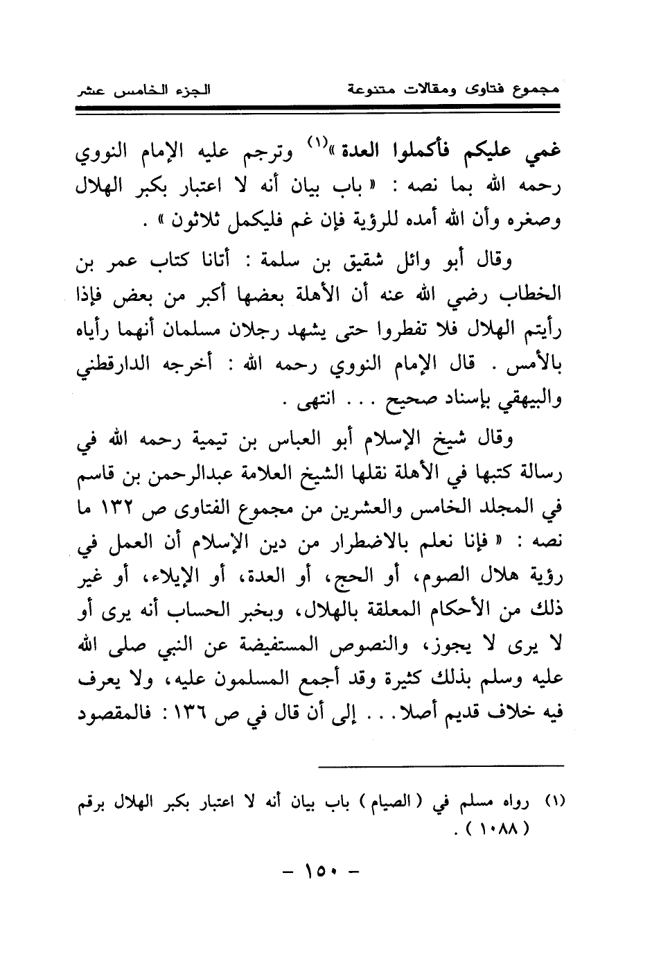 وقال شيخ الإسلام أبو العباس ابن تيمية رحمه الله في رسالة كتبها في الأهلة نقلها الشيخ العلامة عبد الرحمن بن قاسم في المجلد الخامس والعشرين من مجموع الفتاوى ص 132 ما نصه: فإنا نعلم بالاضطرار من دين الإسلام أن العمل في رؤية هلال الصوم، أو الحج، أو العدة، أو الإيلاء، أو غير ذلك من الأحكام المعلقة بالهلال، وبخبر الحساب أنه يرى أو لا يرى لا يجوز، والنصوص المستفيضة عن النبي صلى الله عليه وسلم بذلك كثيرة، وقد أجمع المسلمون عليه، ولا يعرف فيه خلاف قديم أصلا.. إلى أن قال في ص 136: فالمقصود