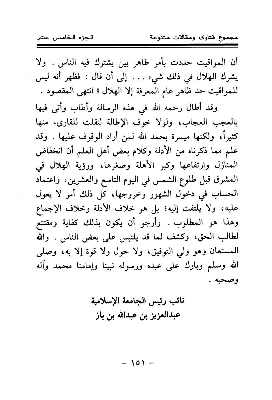 وقد أطال رحمه الله في هذه الرسالة وأطاب وأتى فيها بالعجب العجاب، ولولا خوف الإطالة لنقلت للقارئ منها كثيرا، ولكنها ميسرة بحمد الله لمن أراد الوقوف عليها. وقد علم مما ذكرناه من الأدلة وكلام بعض أهل العلم أن انخفاض المنازل وارتفاعها وكبر الأهلة وصغرها، ورؤية الهلال في المشرق قبل طلوع الشمس في اليوم التاسع والعشرين، واعتماد الحساب في دخول الشهور وخروجها، كل ذلك أمر لا يعول عليه، ولا يلتفت إليه، بل هو خلاف الأدلة وخلاف الإجماع وهذا هو المطلوب. وأرجو أن يكون بذلك كفاية ومقتنع لطالب الحق، وكشف لما قد يلتبس على بعض الناس. والله المستعان وهو ولي التوفيق، ولا حول ولا قوة إلا به، وصلى الله وسلم وبارك على عبده ورسوله نبينا وإمامنا محمد وآله وصحبه.