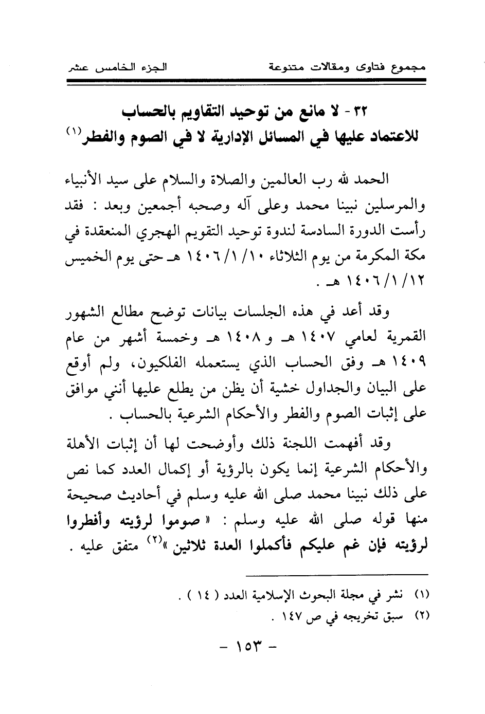 الحمد لله رب العالمين والصلاة والسلام على سيد الأنبياء والمرسلين نبينا محمد وعلى آله وصحبه أجمعين وبعد: فقد رأست الدورة السادسة لندوة توحيد التقويم الهجري المنعقدة في مكة المكرمة من يوم الثلاثاء 10\1\1406هـ حتى يوم الخميس 12\1\1406هـ.