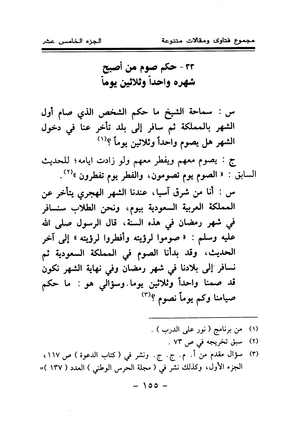 س: أنا من شرق آسيا، عندنا الشهر الهجري يتأخر عن المملكة العربية السعودية بيوم، ونحن الطلاب سنسافر في شهر رمضان في هذه السنة، قال الرسول صلى الله عليه وسلم: «صوموا لرؤيته وأفطروا لرؤيته (¬1) » ، إلى آخر الحديث، وقد بدأنا الصوم في المملكة السعودية ثم نسافر إلى بلادنا في شهر رمضان وفي نهاية الشهر نكون قد صمنا واحدا وثلاثين يوما. وسؤالي هو: ما حكم صيامنا وكم يوما نصوم؟