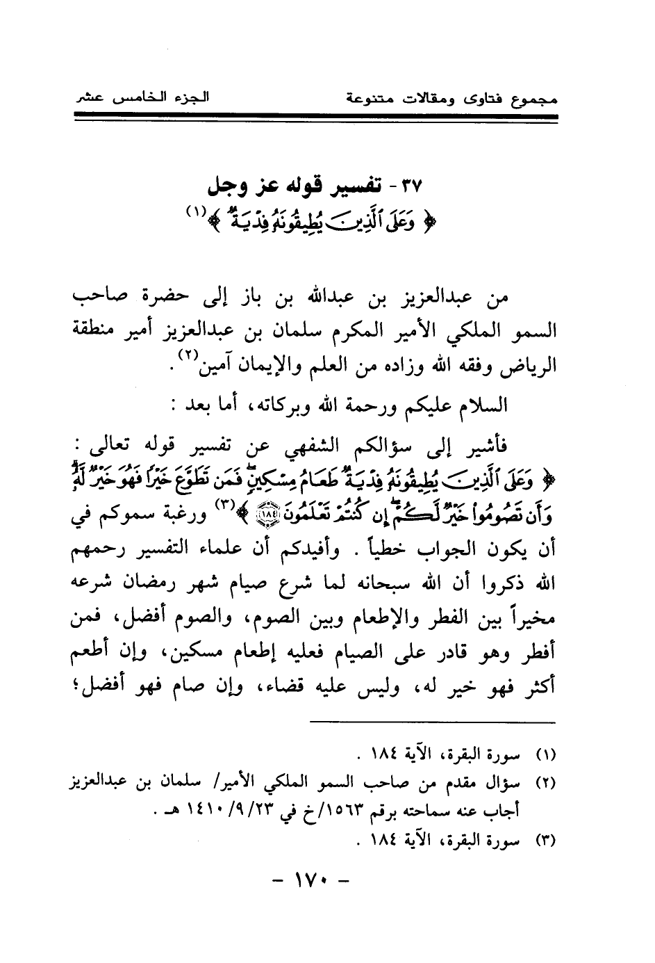 فأشير إلى سؤالكم الشفهي عن تفسير قوله تعالى: {وَعَلَى الَّذِينَ يُطِيقُونَهُ فِدْيَةٌ طَعَامُ مِسْكِينٍ فَمَنْ تَطَوَّعَ خَيْرًا فَهُوَ خَيْرٌ لَهُ وَأَنْ تَصُومُوا خَيْرٌ لَكُمْ إِنْ كُنْتُمْ تَعْلَمُونَ} (¬2) ورغبة سموكم في أن يكون الجواب خطيا. وأفيدكم أن علماء التفسير رحمهم الله ذكروا أن الله سبحانه لما شرع صيام شهر رمضان شرعه مخيرا بين الفطر والإطعام وبين الصوم، والصوم أفضل، فمن أفطر وهو قادر على الصيام فعليه إطعام مسكين، وإن أطعم أكثر فهو خير له، وليس عليه قضاء، وإن صام فهو أفضل؛