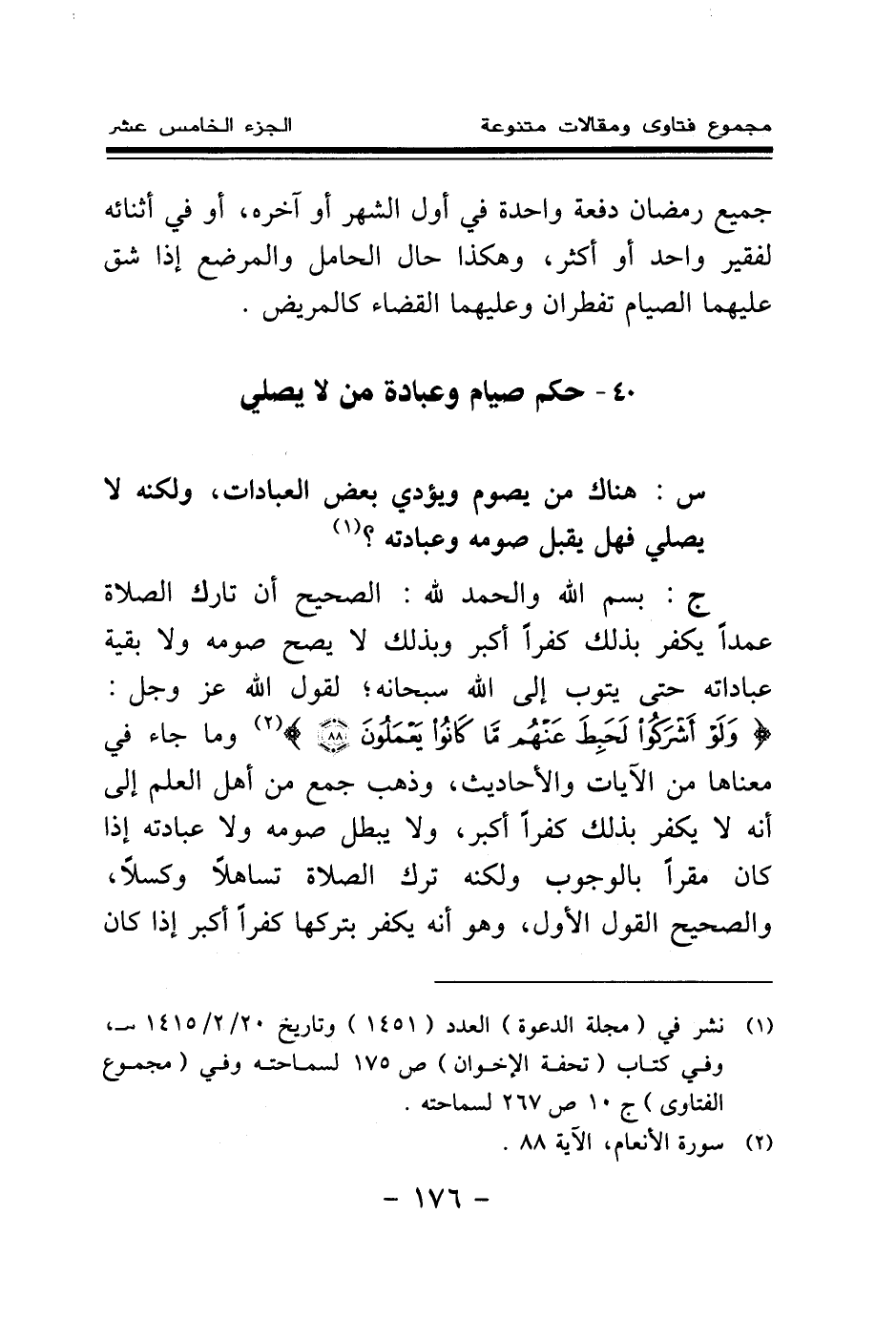 ج: بسم الله والحمد لله: الصحيح أن تارك الصلاة عمدا يكفر بذلك كفرا أكبر وبذلك لا يصح صومه ولا بقية عباداته حتى يتوب إلى الله سبحانه؛ لقول الله عز وجل: {وَلَوْ أَشْرَكُوا لَحَبِطَ عَنْهُمْ مَا كَانُوا يَعْمَلُونَ} (¬1) وما جاء في معناها من الآيات والأحاديث، وذهب جمع من أهل العلم إلى أنه لا يكفر بذلك كفرا أكبر، ولا يبطل صومه ولا عبادته إذا كان مقرا بالوجوب، ولكنه ترك الصلاة تساهلا وكسلا، والصحيح القول الأول، وهو أنه يكفر بتركها كفرا أكبر إذا كان
