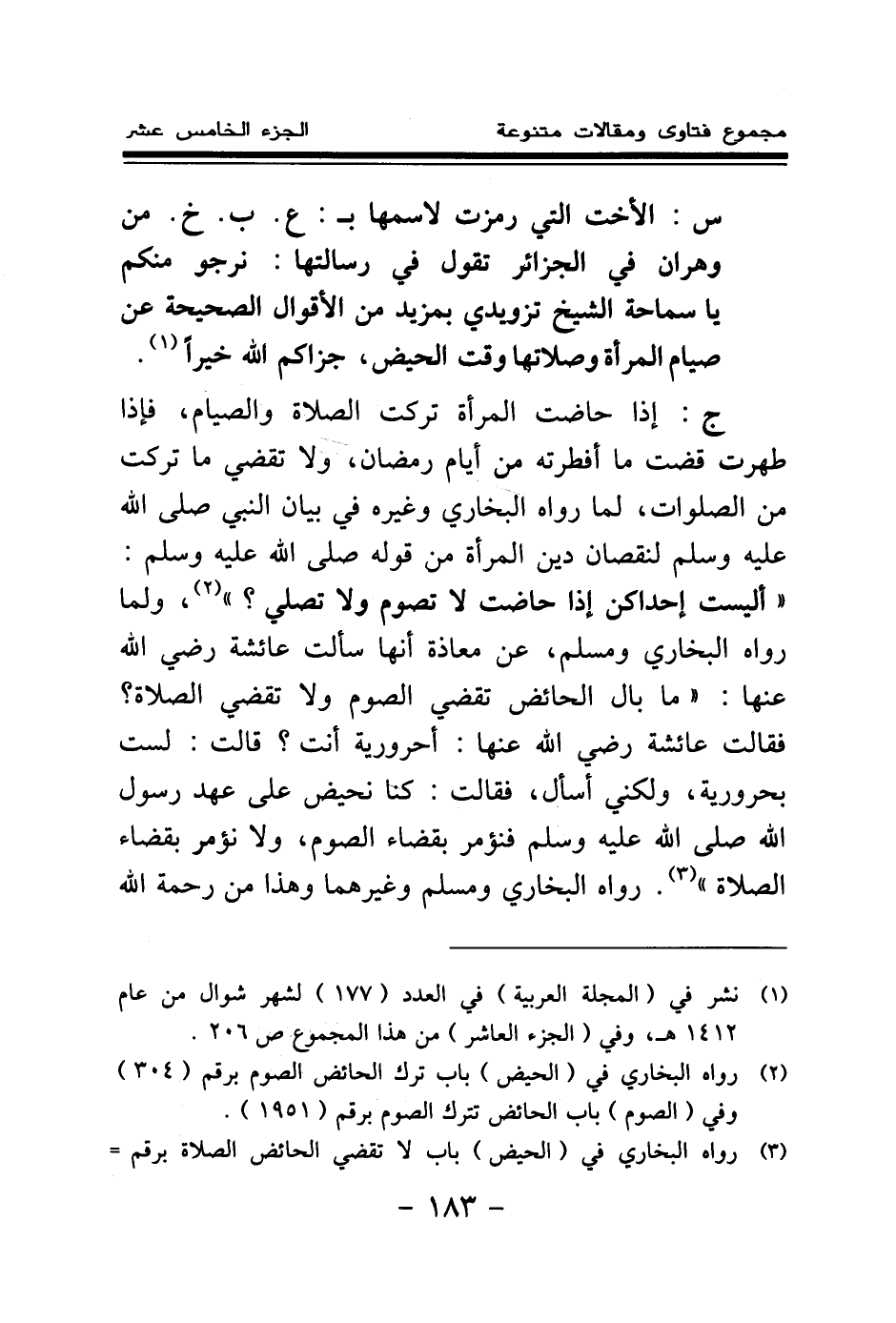 (¬2) رواه البخاري في (الحيض) باب لا تقضي الحائض الصلاة برقم (321) ، ومسلم في (الحيض) باب وجوب قضاء الصوم على الحائض برقم (335) .