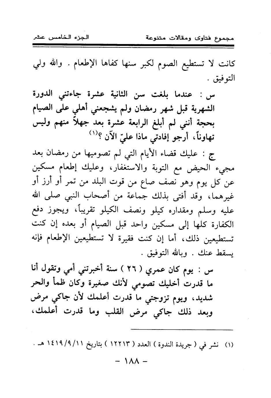 س: يوم كان عمري (26) سنة أخبرتني أمي وتقول: أنا ما قدرت أخليك تصومي؛ لأنك صغيرة وكان ظمأ والحر شديد، ويوم تزوجتي ما قدرت أعلمك؛ لأن جاكي مرض وبعد ذلك جاكي مرض القلب وما قدرت أعلمك،