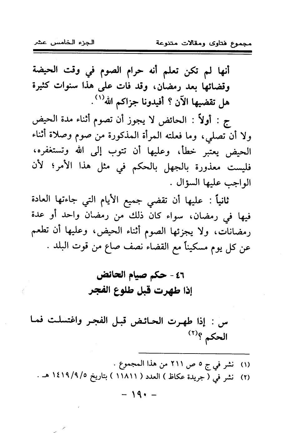 46 - حكم صيام الحائض إذا طهرت قبل طلوع الفجر