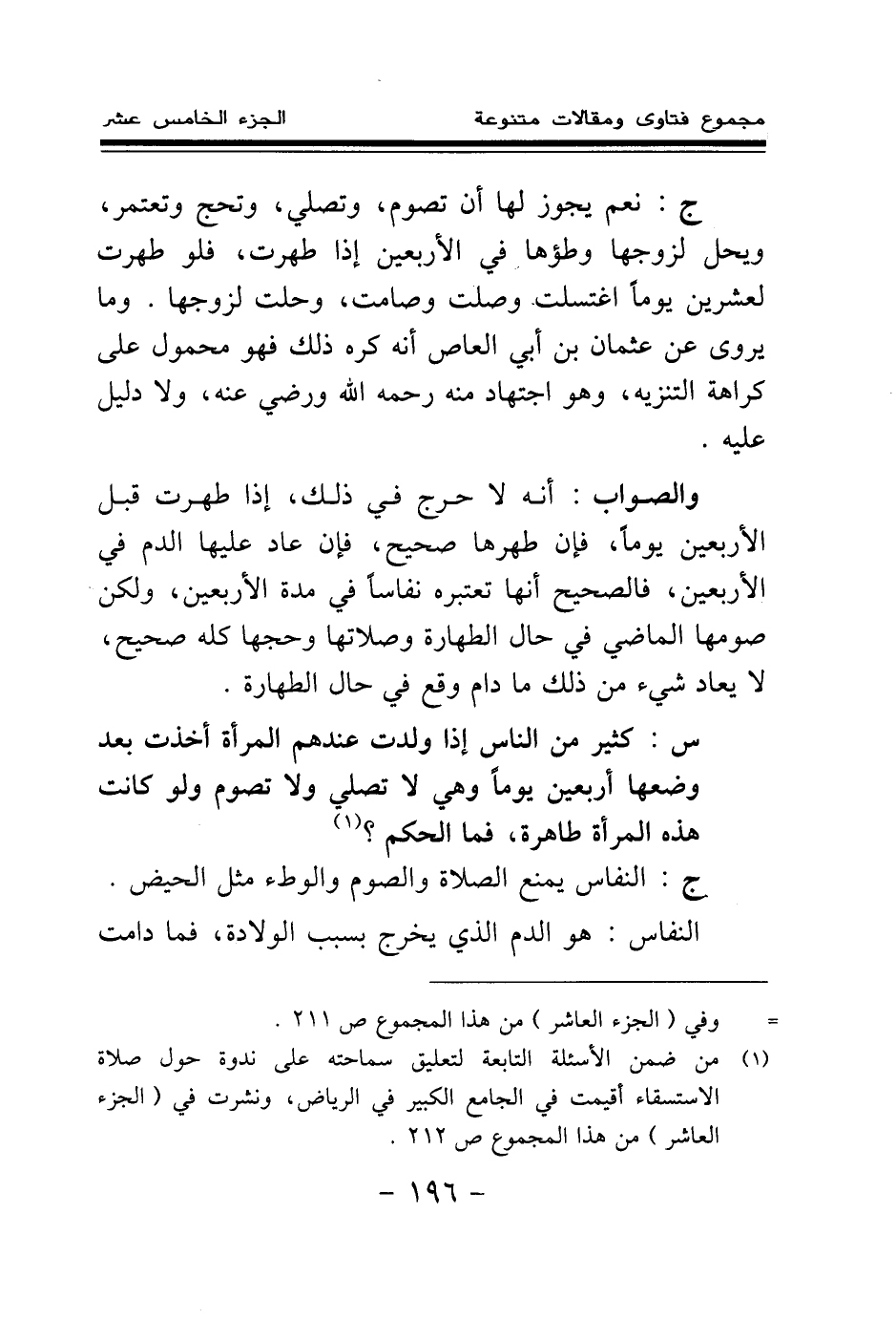 ج: نعم يجوز لها أن تصوم، وتصلي، وتحج وتعتمر، ويحل لزوجها وطؤها في الأربعين إذا طهرت، فلو طهرت لعشرين يوما اغتسلت وصلت وصامت، وحلت لزوجها. وما يروى عن عثمان بن أبي العاص أنه كره ذلك فهو محمول على كراهة التنزيه، وهو اجتهاد منه رحمه الله ورضي عنه، ولا دليل عليه.