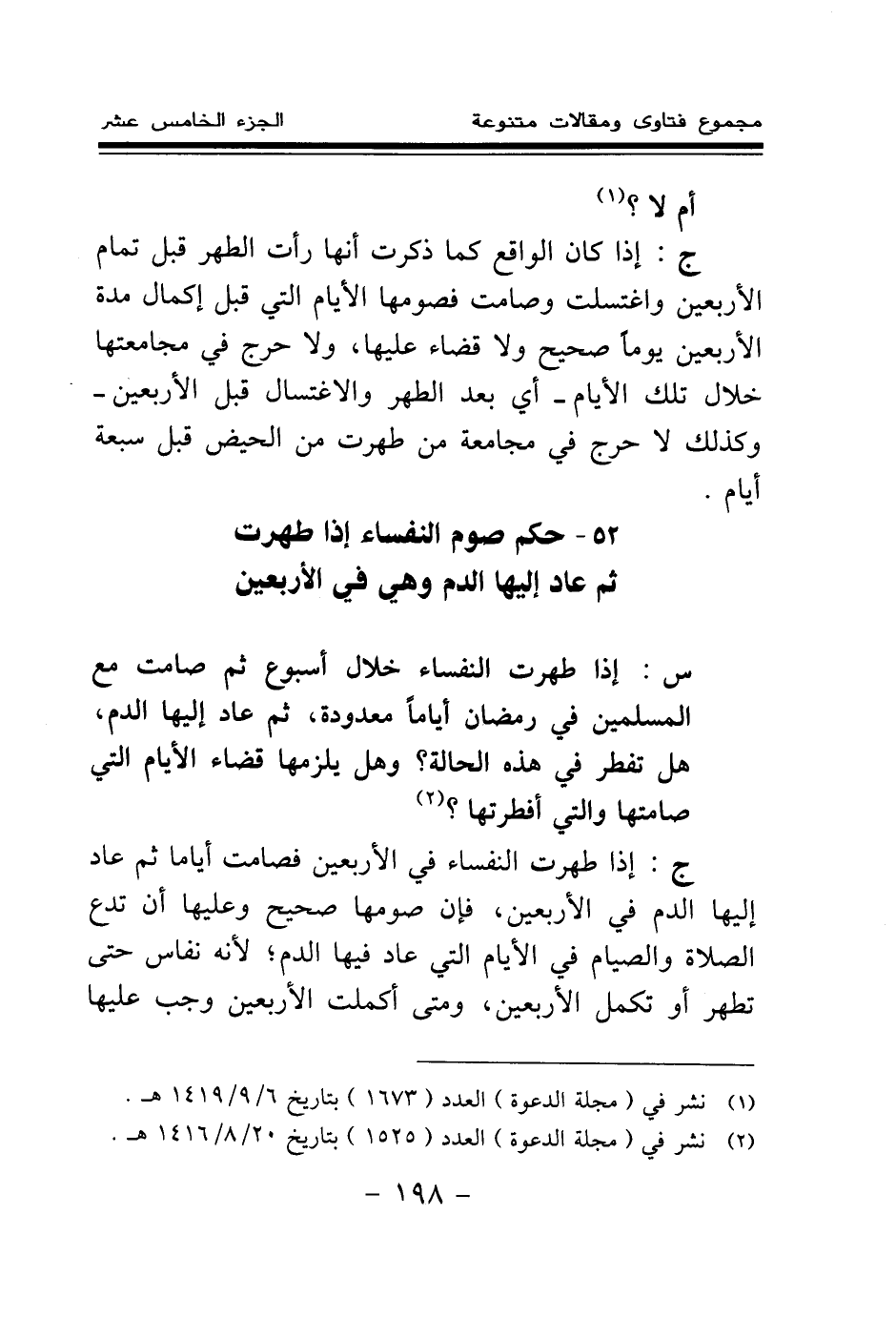 52 - حكم صوم النفساء إذا طهرت ثم عاد إليها الدم وهي في الأربعين