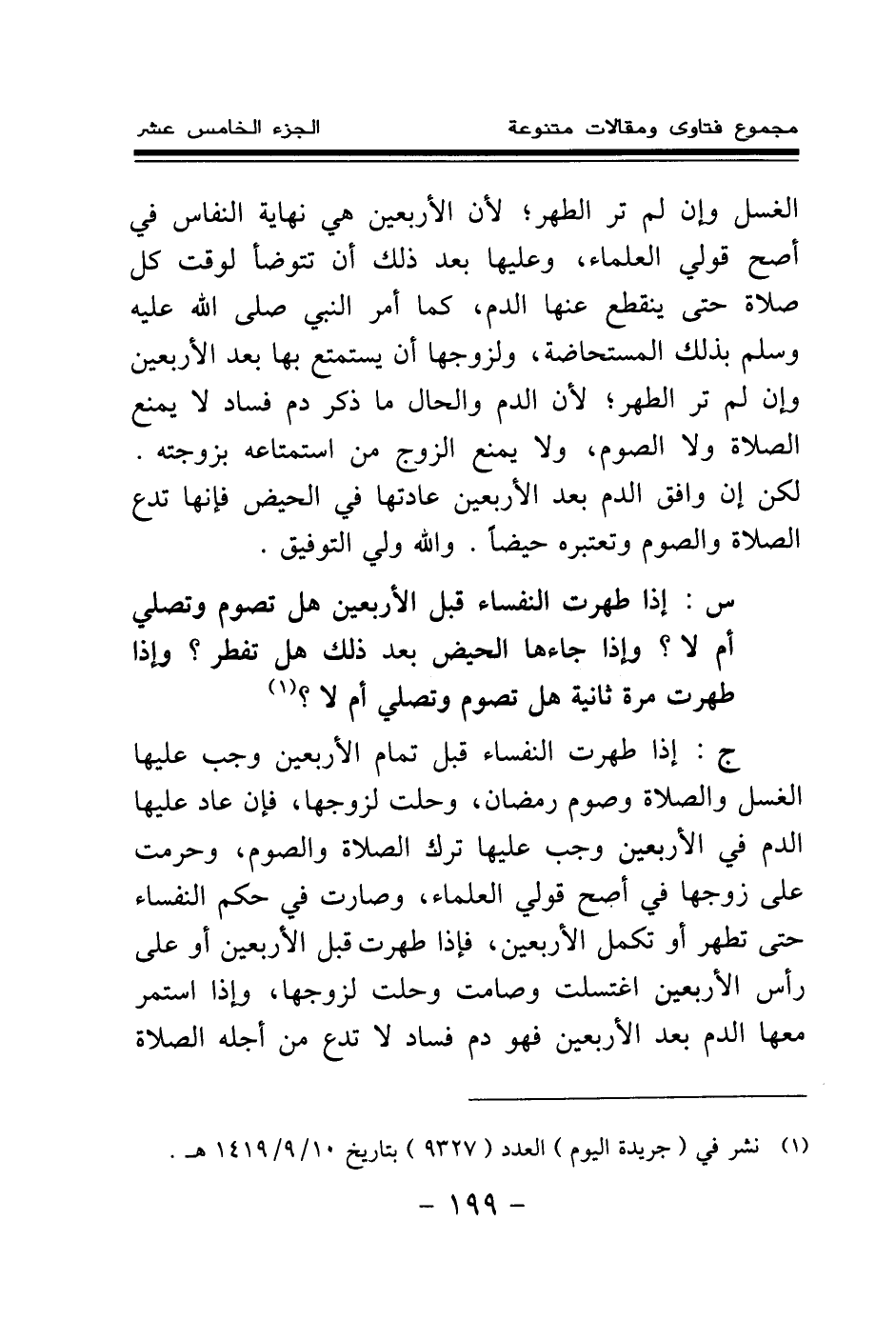 ج: إذا طهرت النفساء قبل تمام الأربعين وجب عليها الغسل والصلاة وصوم رمضان، وحلت لزوجها، فإن عاد عليها الدم في الأربعين وجب عليها ترك الصلاة والصوم، وحرمت على زوجها في أصح قولي العلماء، وصارت في حكم النفساء حتى تطهر أو تكمل الأربعين، فإذا طهرت قبل الأربعين أو على رأس الأربعين اغتسلت وصامت وحلت لزوجها، وإذا استمر معها الدم بعد الأربعين فهو دم فساد لا تدع من أجله الصلاة