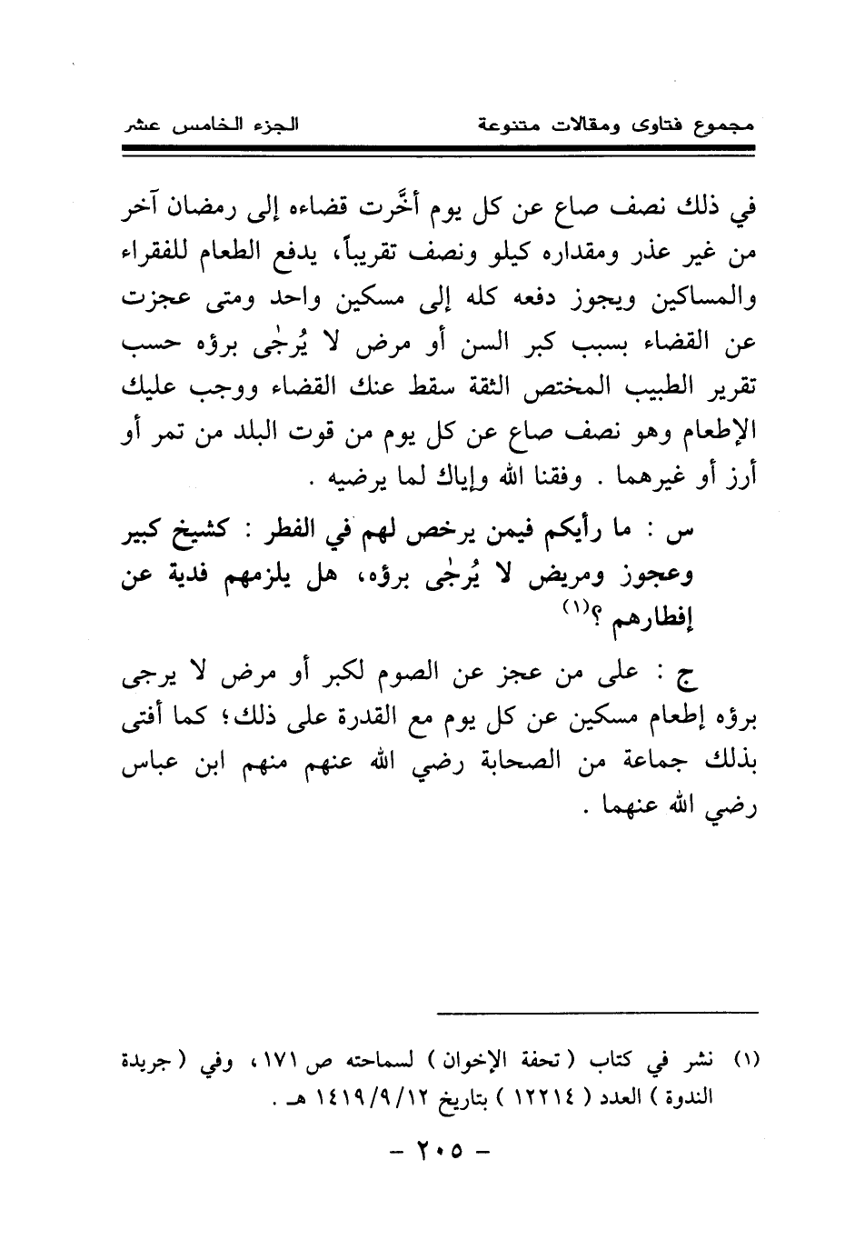 س: ما رأيكم فيمن يرخص لهم في الفطر: كشيخ كبير وعجوز ومريض لا يرجى برؤه، هل يلزمهم فدية عن إفطارهم؟ (¬1)
