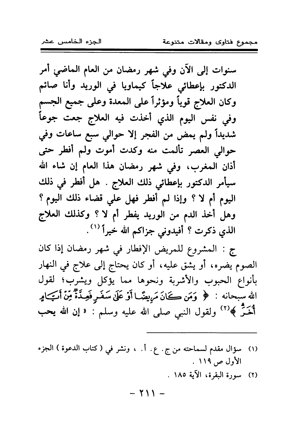 ج: المشروع للمريض الإفطار في شهر رمضان إذا كان الصوم يضره، أو يشق عليه، أو كان يحتاج إلى علاج في النهار بأنواع الحبوب والأشربة ونحوها مما يؤكل ويشرب؛ لقول الله سبحانه: {وَمَنْ كَانَ مَرِيضًا أَوْ عَلَى سَفَرٍ فَعِدَّةٌ مِنْ أَيَّامٍ أُخَرَ} (¬2) ولقول النبي صلى الله عليه وسلم: «إن الله يحب