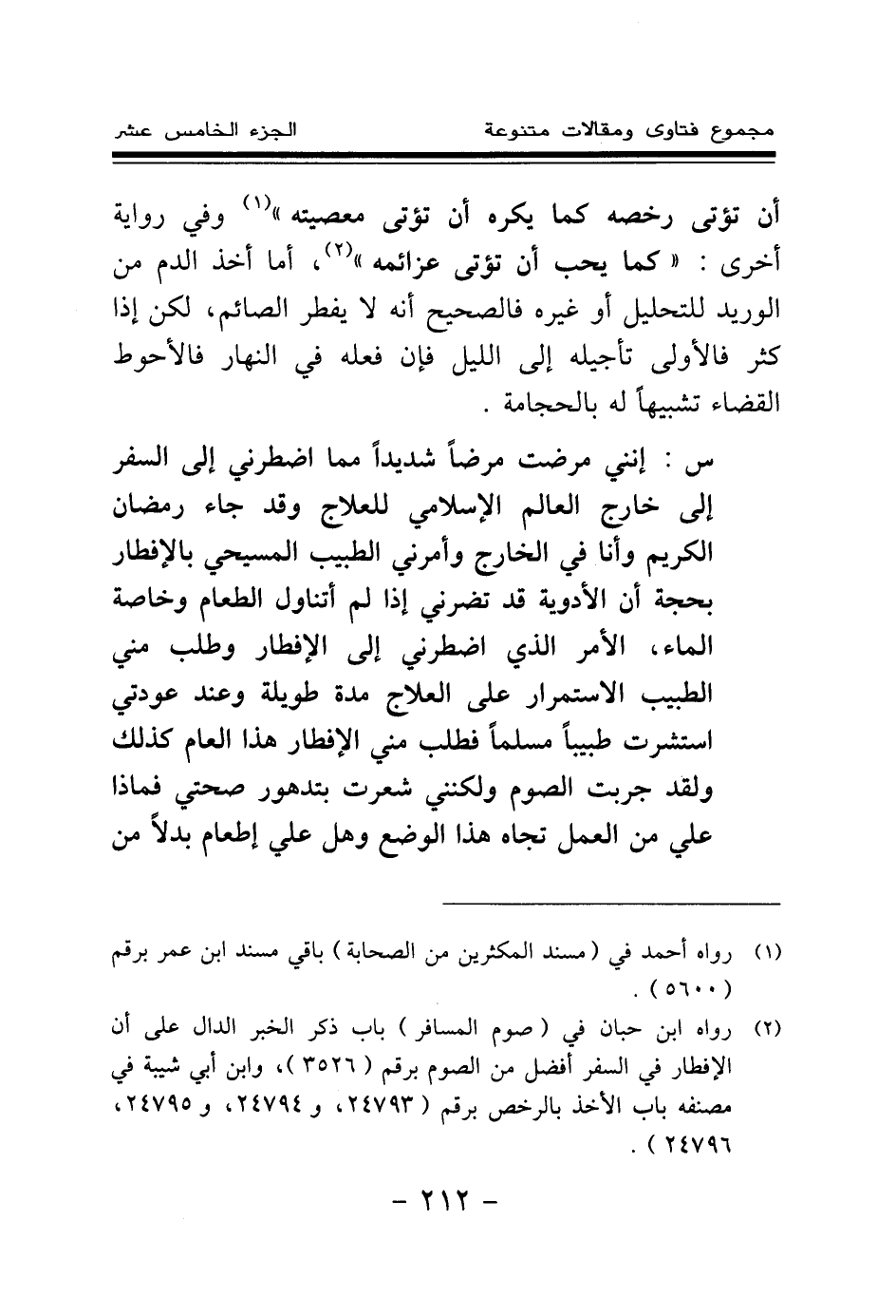 (¬2) رواه ابن حبان في (صوم المسافر) باب ذكر الخبر الدال على أن الإفطار في السفر أفضل من الصوم برقم (3526) ، وابن أبي شيبة في مصنفه باب الأخذ بالرخص برقم (24793، و24794، و24795، 24796) .