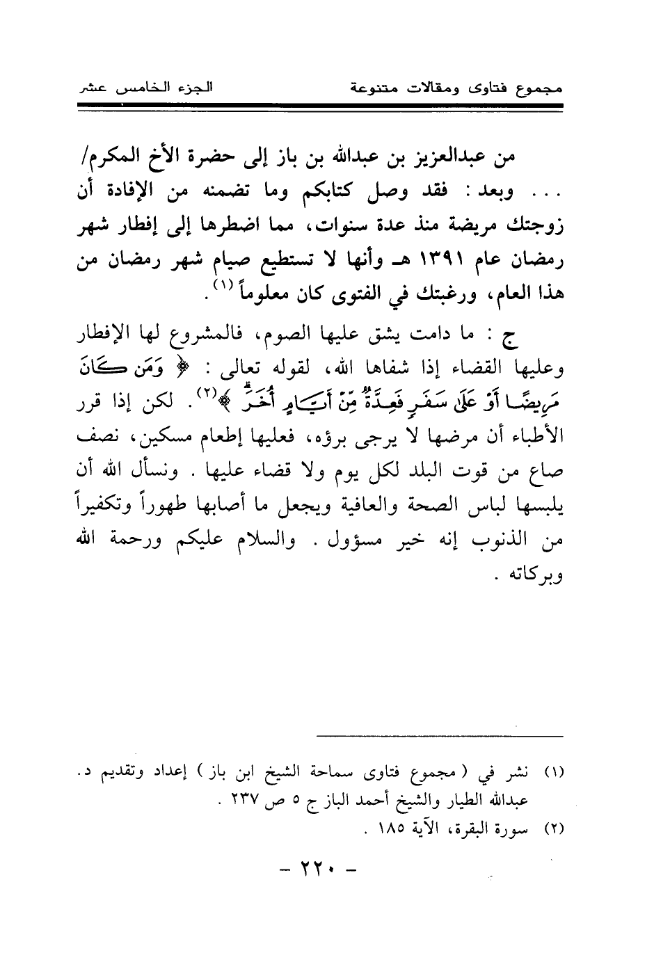 من عبد العزيز بن عبد الله بن باز إلى حضرة الأخ المكرم \ ... وبعد: فقد وصل كتابكم وما تضمنه من الإفادة أن زوجتك مريضة منذ عدة سنوات، مما اضطرها إلى إفطار شهر رمضان عام 1391 هـ، وأنها لا تستطيع صيام شهر رمضان من هذا العام، ورغبتك في الفتوى كان معلوما.
